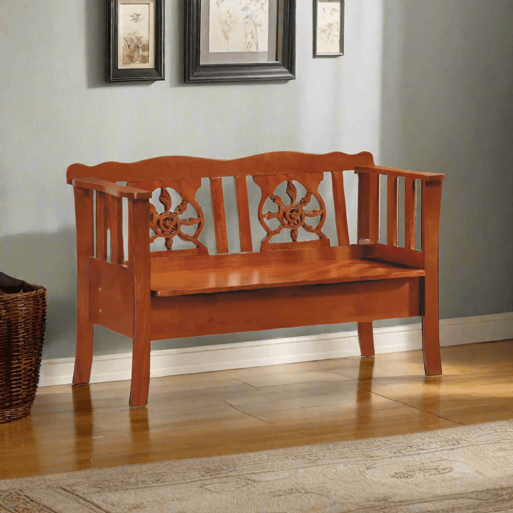 The Lucan Wooden Bench with Storage blends traditional design with everyday practicality. Crafted from solid wood and finished in a warm cherry tone, this piece features a lift-up seat that reveals generous hidden storage space. Perfect for entryways, bedrooms, or living areas, it adds vintage character while keeping clutter out of sight.