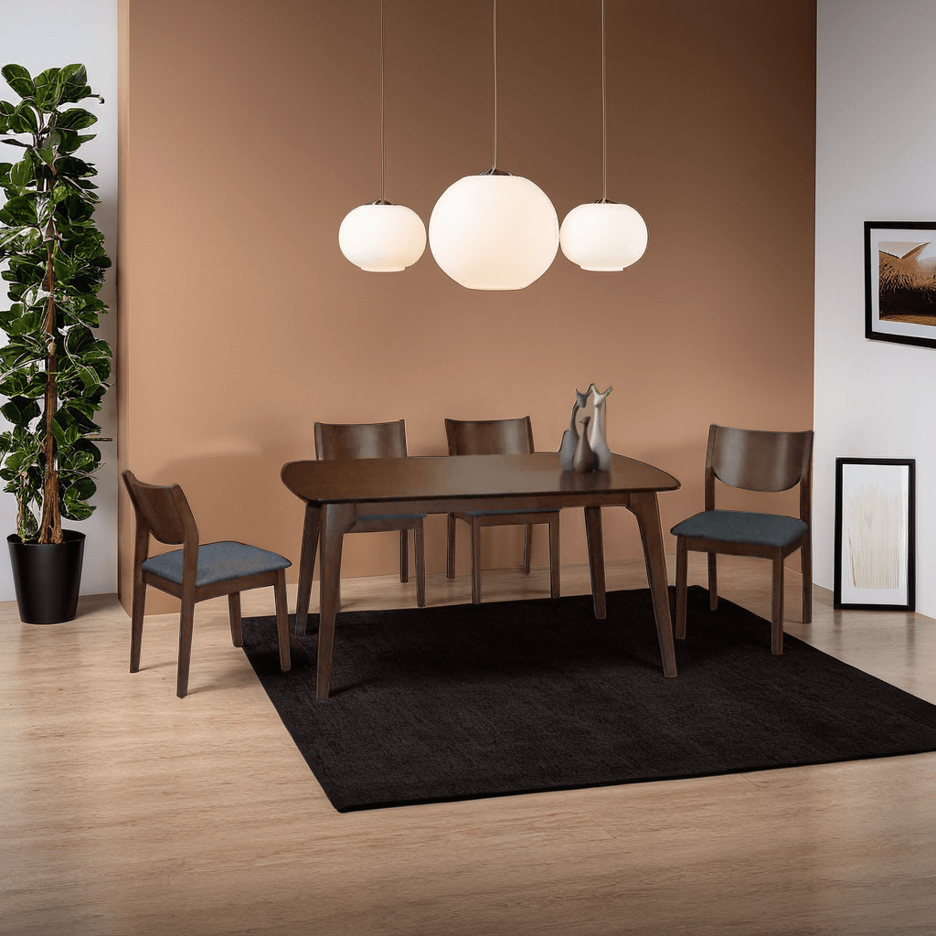 The Harriot Dining Set (1+4) includes a sturdy table and four cosy chairs, all crafted from solid rubber wood and finished with a classy wood veneer. It's not just about strength, though – the fabric cushion seats are all about comfort, making those long dinners or quick breakfasts a real pleasure.