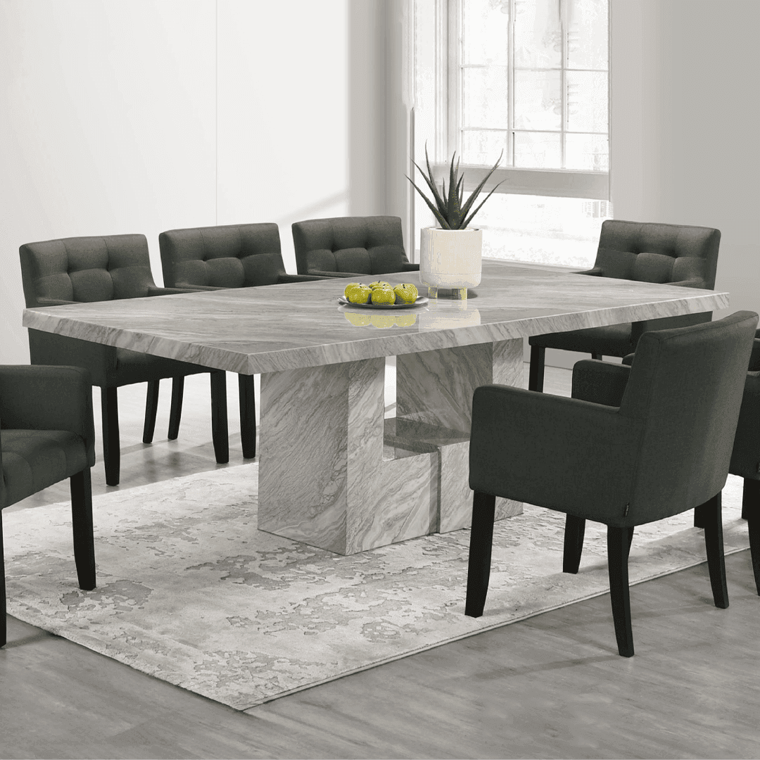 Elevate your dining experience with the Rigur Marble dining table. With its grand design and classic colour, this table exudes luxury and sophistication. Crafted with high-quality marble, it adds an elegant touch to any dining space. Upgrade your home with this premium piece that is sure to impress.