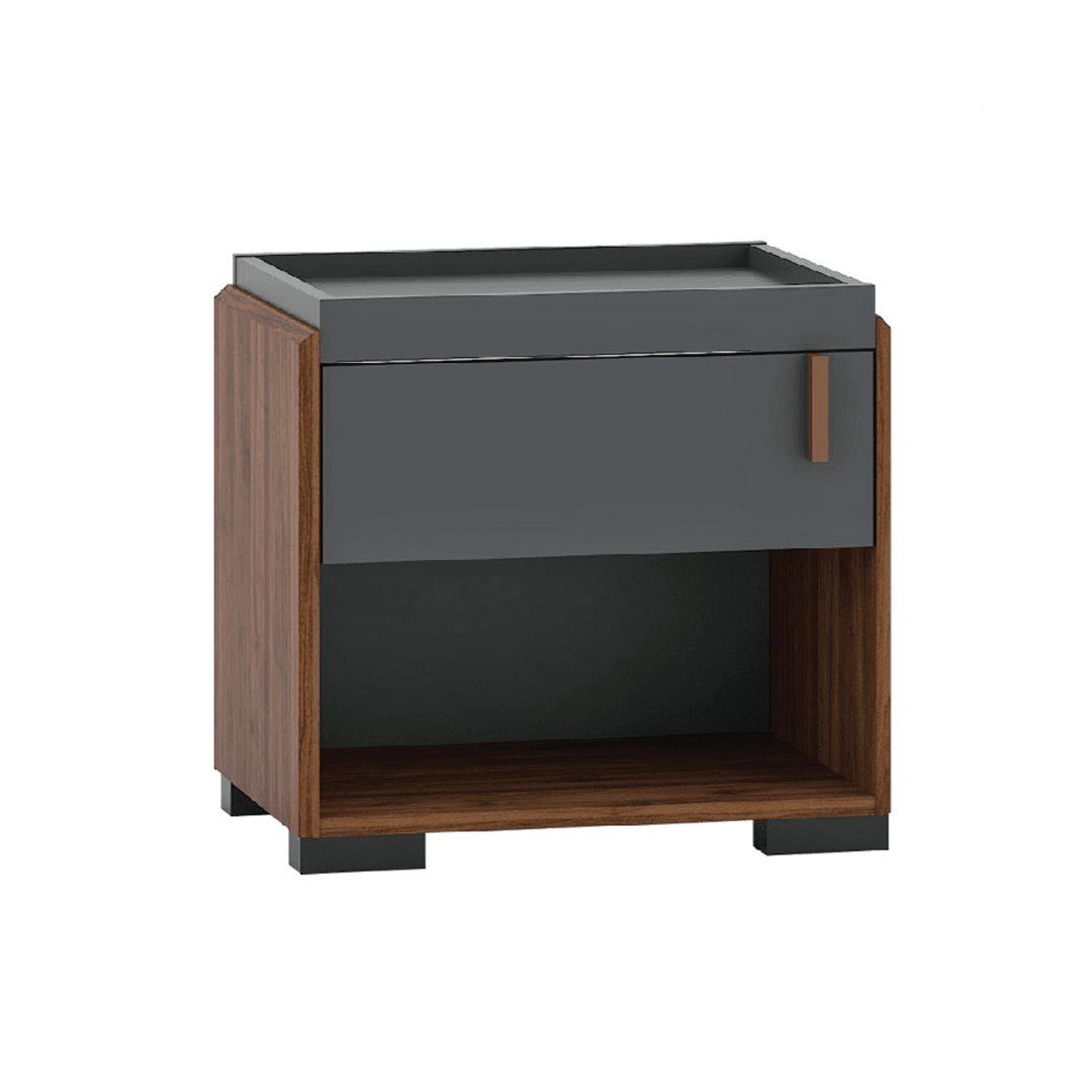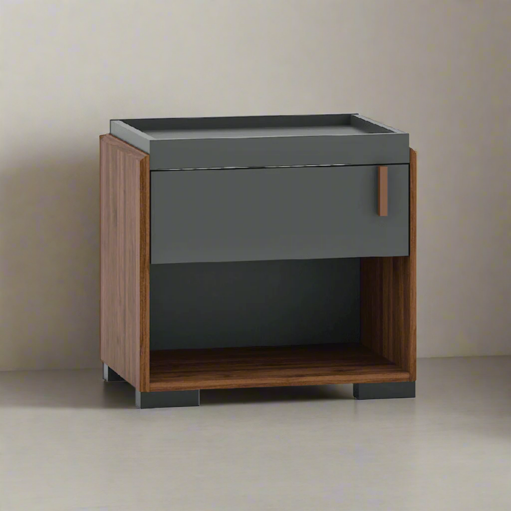 Add a blend of style and practicality to your bedroom with the Britton Bedside Table. Designed in a sophisticated dark grey with warm wooden side accents, this compact piece offers both storage and style in a minimalist form.