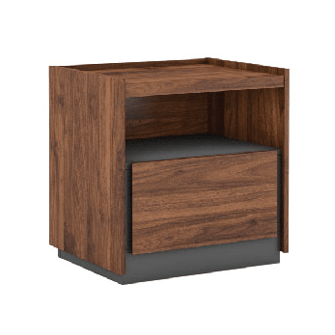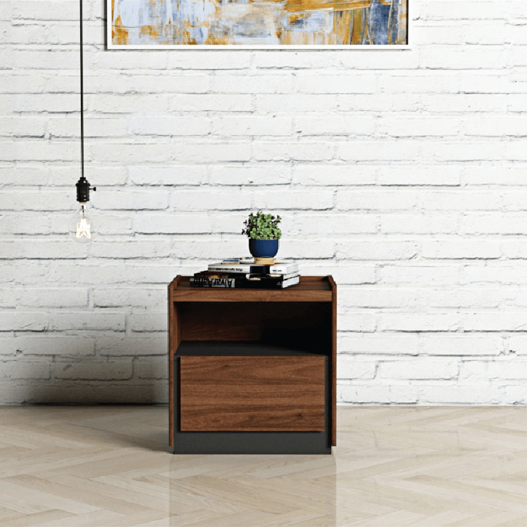 Designed for both function and style, it features 1 drawer for storing personal items, 1 open shelf for quick access essentials, and thoughtfully designed raised sides on the tabletop to help prevent small items from slipping off.