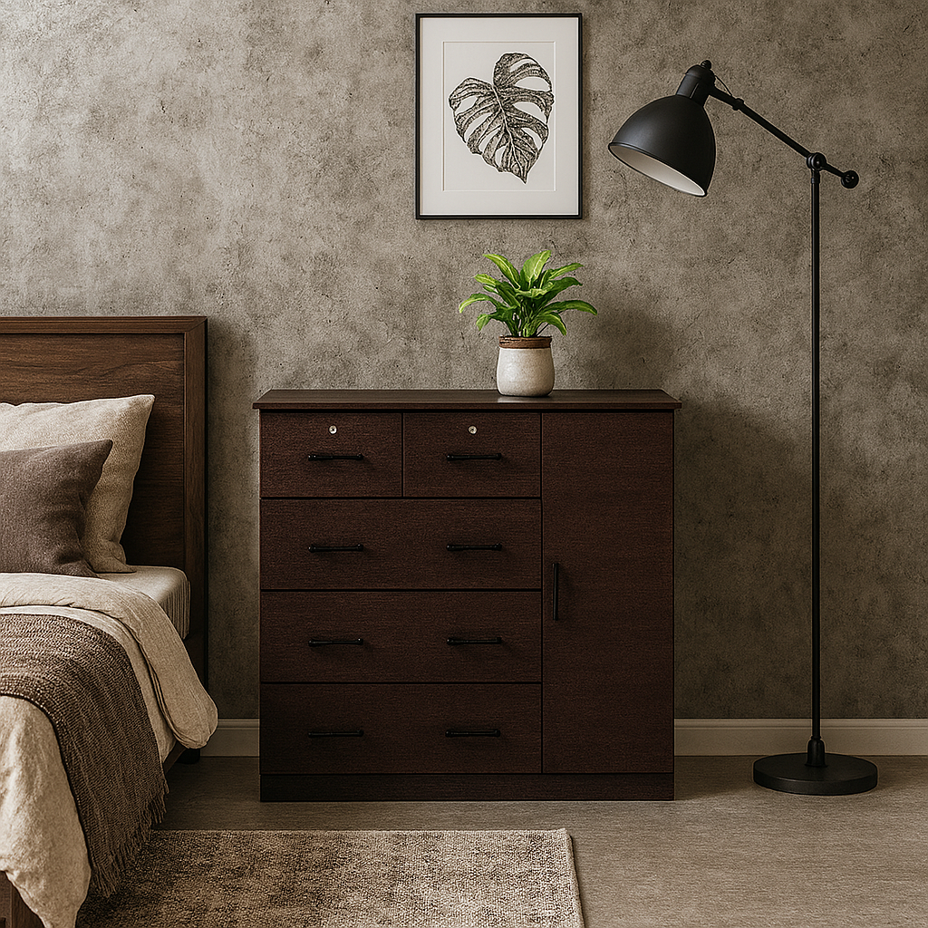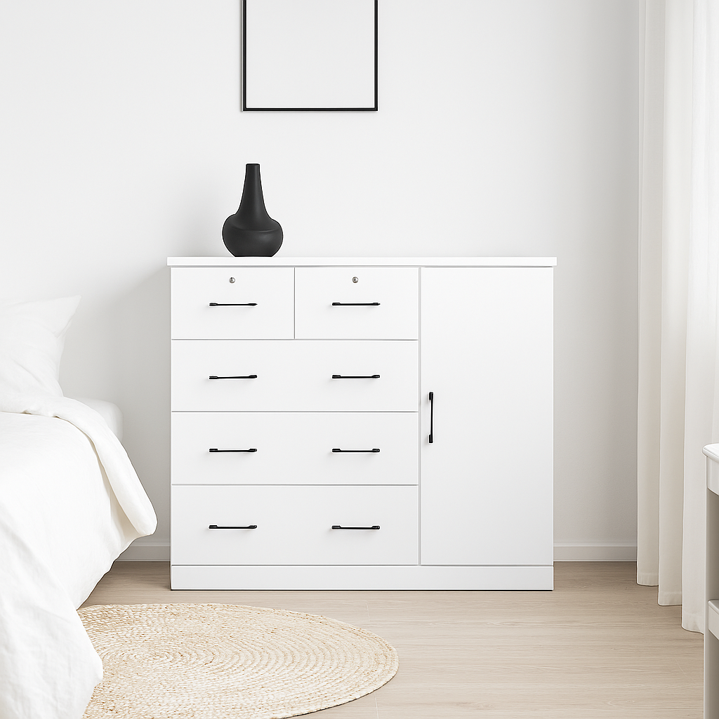 A clean, minimalist and spacious piece, Brookson Senior Chest Of Drawer offers its beauty and function that everyone will love. This unit presents a fascinating minimalist appeal and versatile drawer style. The combination of spacious pull-out drawers and two mini top drawers give you enough room to organise your clothes, beddings, linens, and accessories in one place.
