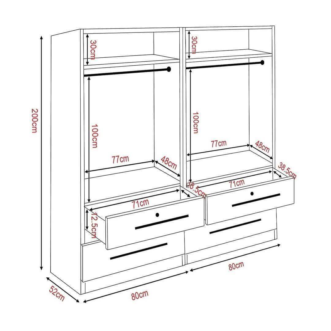 Featuring four open doors and integrated drawers, the Deverac II 4 Open Door Wardrobe with Drawers offers ample storage space for your clothes and accessories while keeping everything organised and easily accessible. With straightforward design, this wardrobe combines modern aesthetics with practicality, making it a must-have for any home.