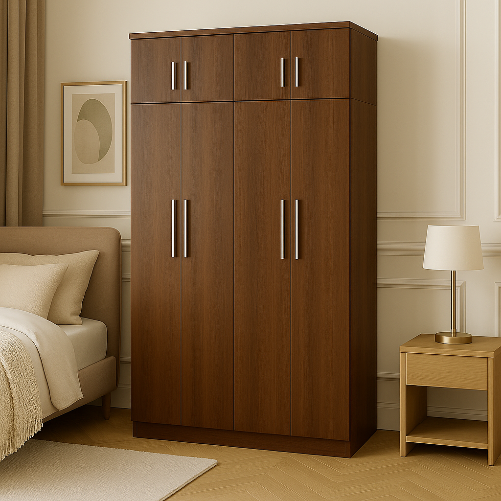 The perfect spot to organise your lovely bedroom space, the Deverel 4 Door Wardrobe with Top offers both style and functionality in one elegant package. With its spacious design and four open doors, this wardrobe provides ample room to neatly store and organise your clothes, shoes, and accessories.