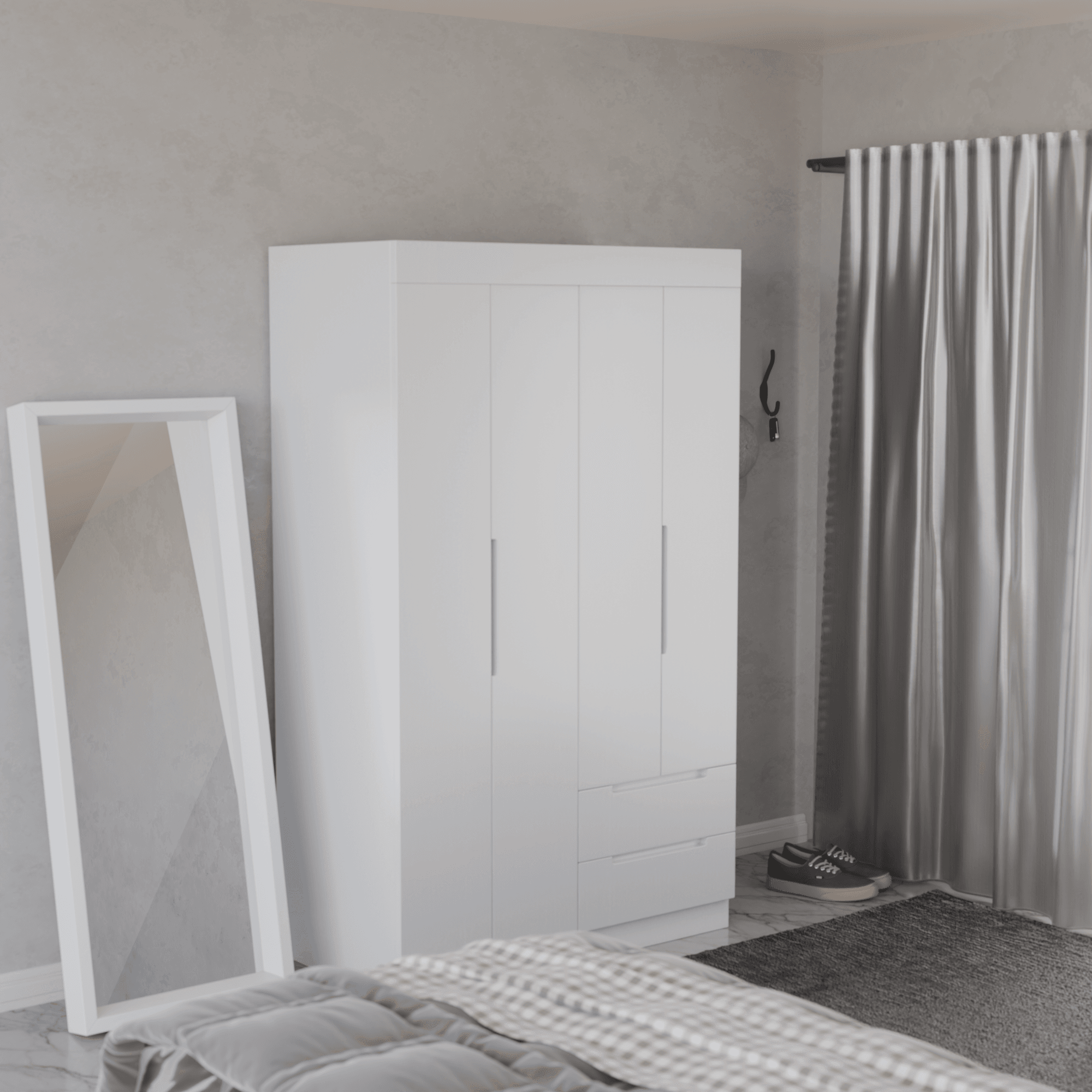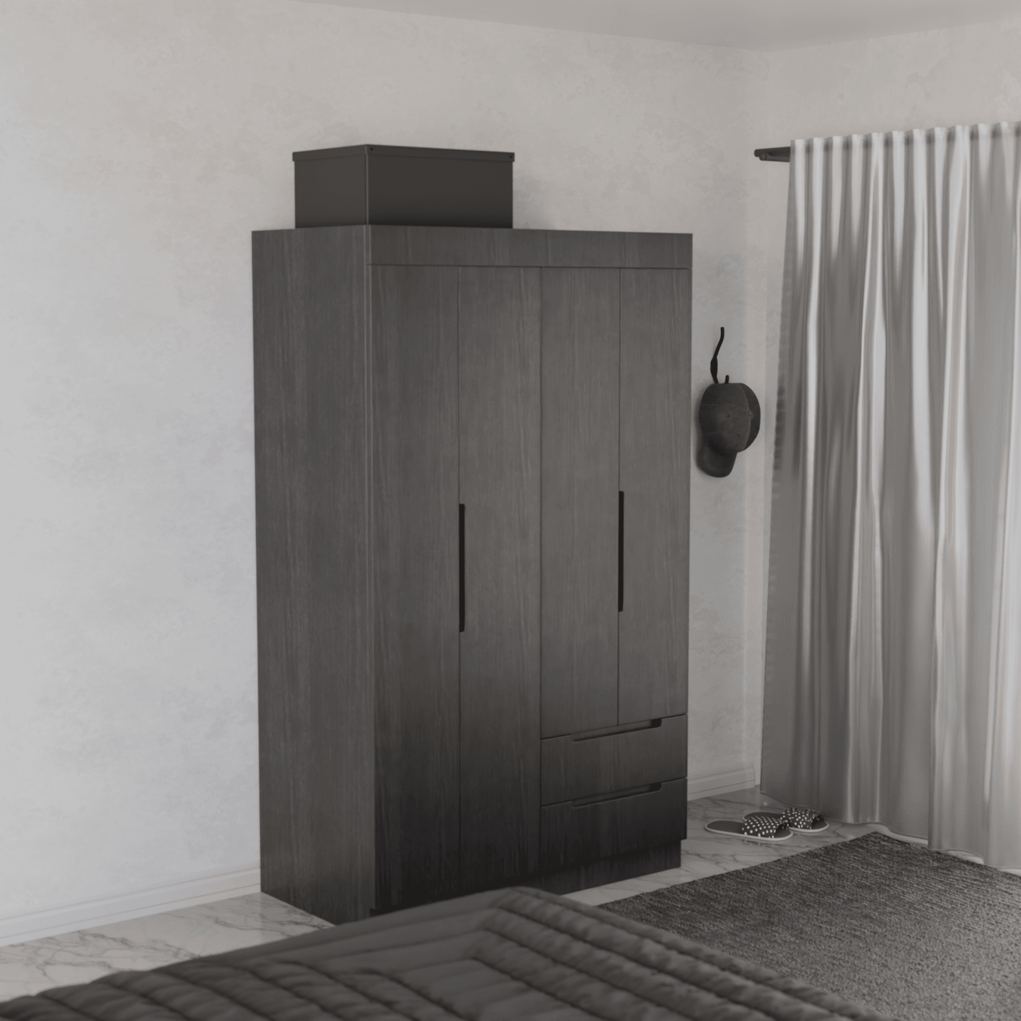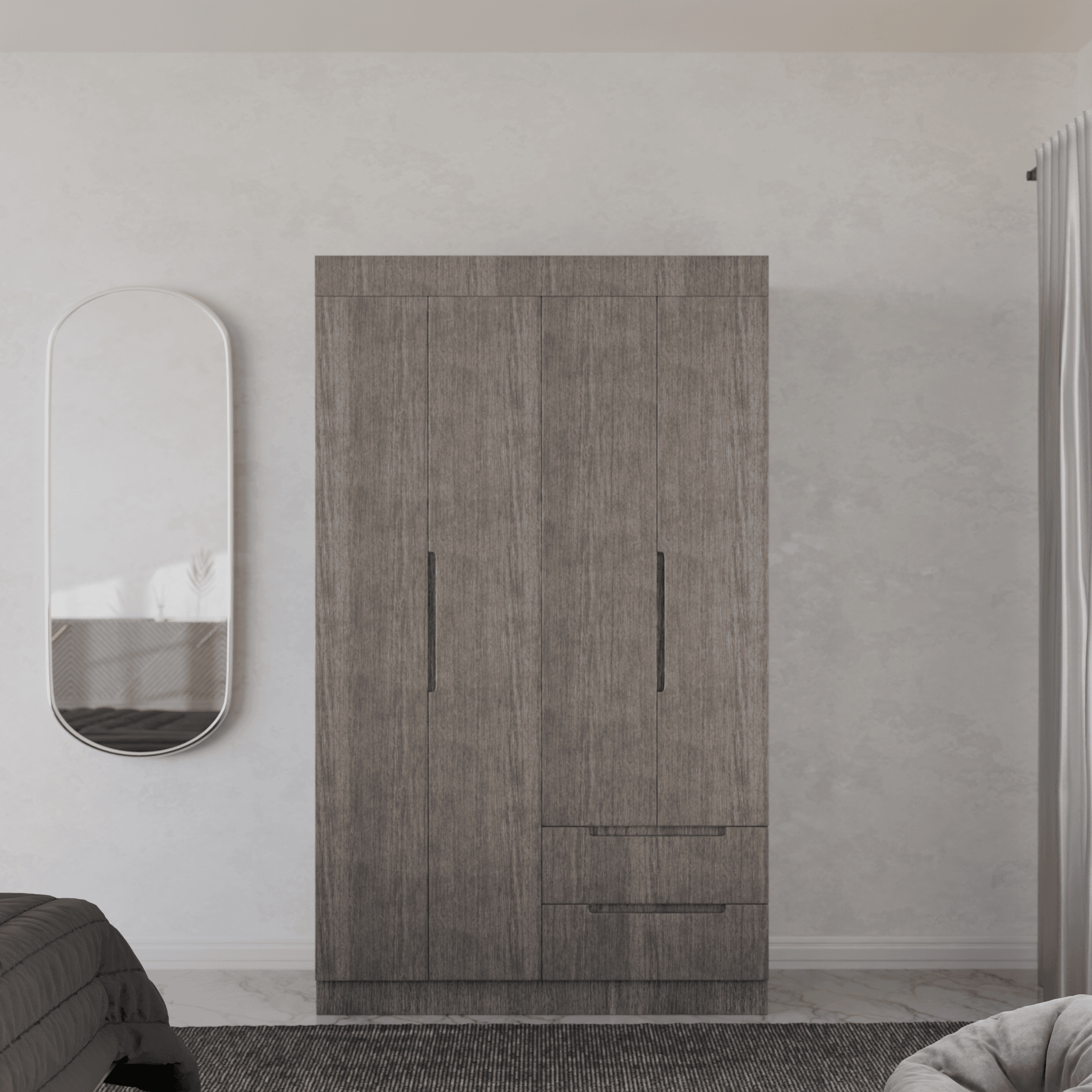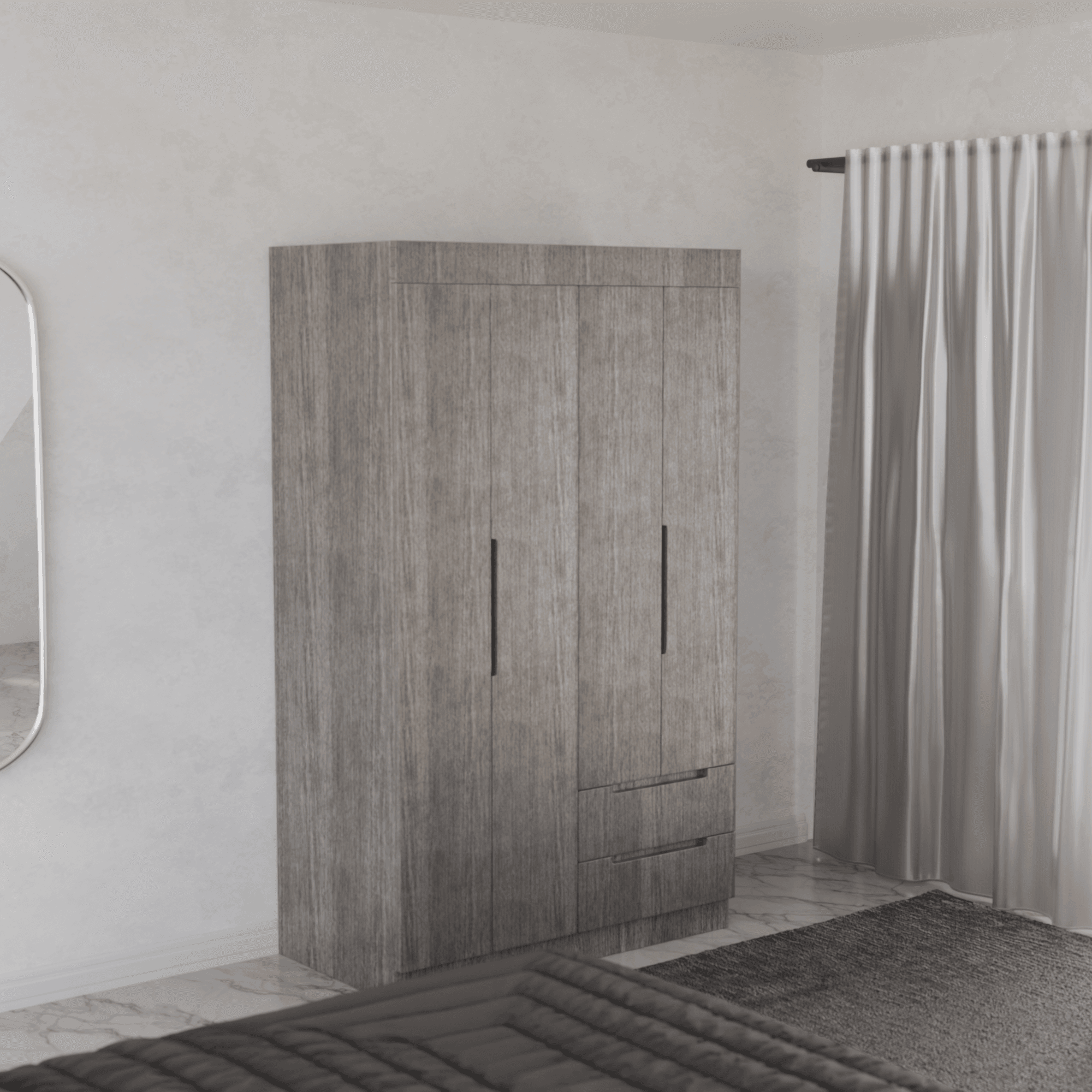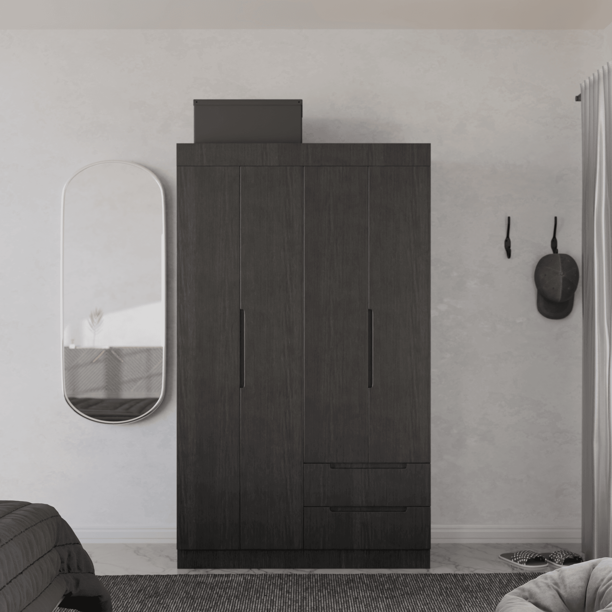 Introducing the Harrison 4-Door Open Wardrobe! A stunning combination of solid plywood with sleek black iron handles, and hinged doors for smooth, gentle closure. It also features two drawers and three clothes rods, making it the perfect storage companion!