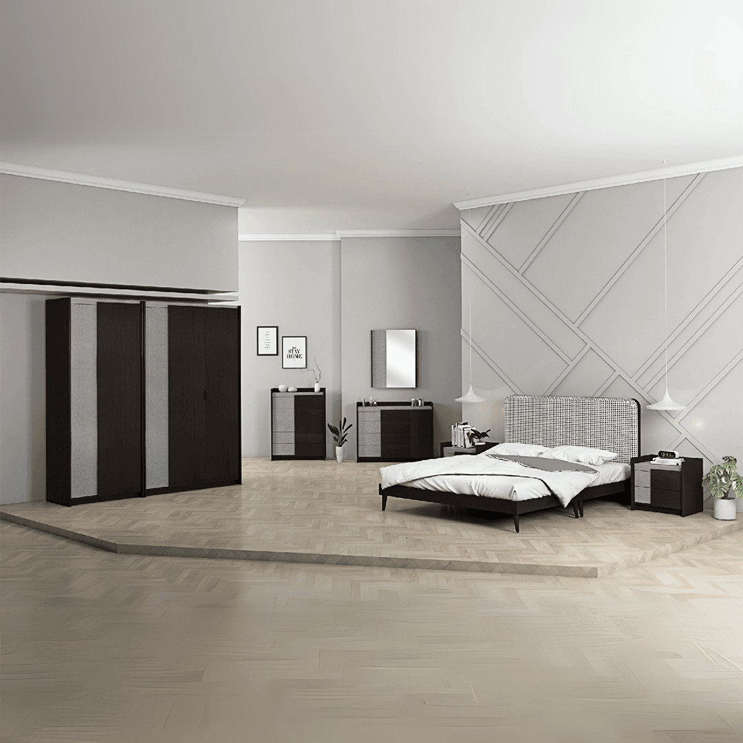 1 x Queen Sized Bed, 1 x Bedside Table, 1 x Dressing Table with Stool, 1 x Chest of Drawer, and 1 x Sliding Door Wardrobe.