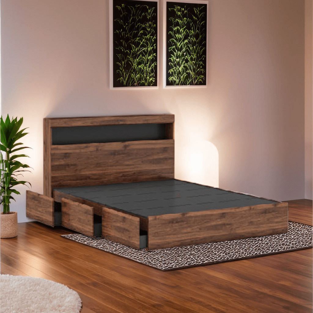 Maximize Your Bedroom Space – The Scout Wooden Bed combines smart storage solutions with a stylish Columbia Wood finish.