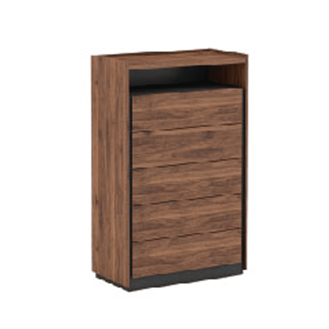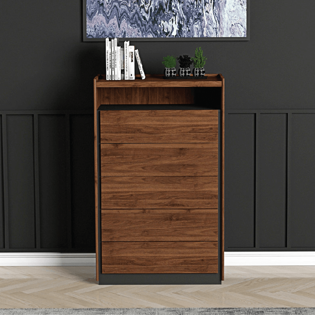 The Scout Wooden Chest of Drawers (76cm) blends clean Scandinavian design with practical storage solutions. Made from durable particle board and accented with sleek dark grey panels, this tall chest offers five spacious drawers and an open shelf to neatly organize your essentials. The raised side panels on top help secure smaller items, adding thoughtful functionality to its modern aesthetic.