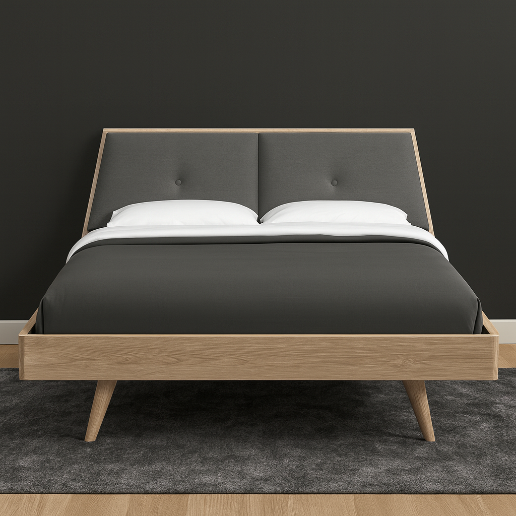 Elegant & Functional Design – The Trystan Wooden Bed Frame blends a warm Hana Oak finish with a soft grey cushion headboard, adding both style and comfort to your bedroom.