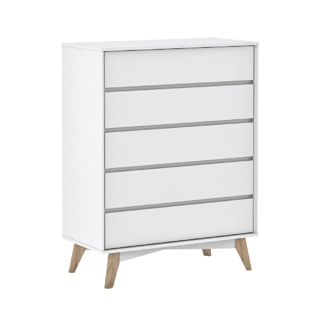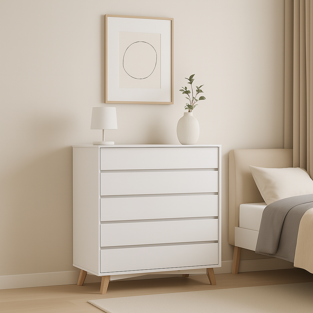 Organize your essentials effortlessly with the Xandra White Chest of Drawers. Designed with a clean white body and supported by light oak coloured legs, this chest of drawers adds a fresh and modern feel to any room. Its minimalist aesthetic is perfect for Scandinavian, contemporary, or cozy farmhouse interiors.