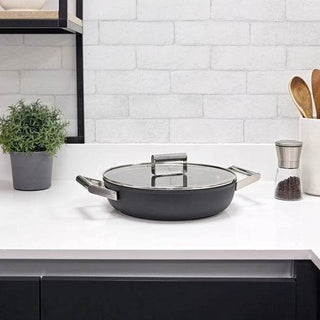The two stainless steel durable side handles have been designed with a large, ergonomic shape, for a comfortable and safe grip. The dish can easily be transferred from hob to oven to table for serving. The tempered glass lid features a steel handle, a steam vent and is transparent, allowing you to monitor cooking at all times.