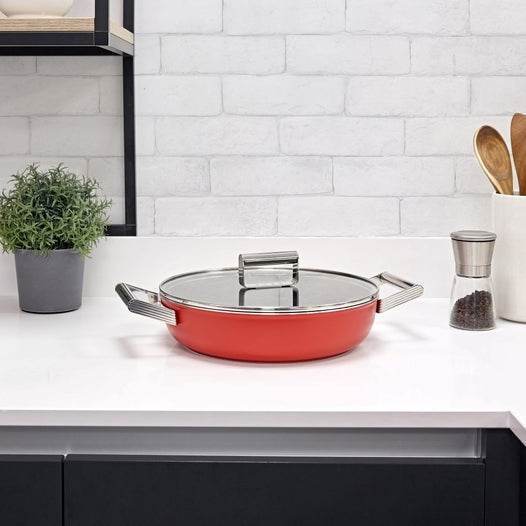 Designed and manufactured in Italy, featuring Smeg's iconic retro design, this is a cookware range you can be proud to display in your kitchen. The wide bottom and low sides of the 28cm diameter, 3.7 litre, Smeg deep pan make it suitable for all kinds of cooking including sauces, braised dishes and vegetable dishes. It's aluminium body guarantees excellent cooking results whilst the non-stick coating allows less oils and fats to be used for healthier cooking. It is also very easy to clean.
