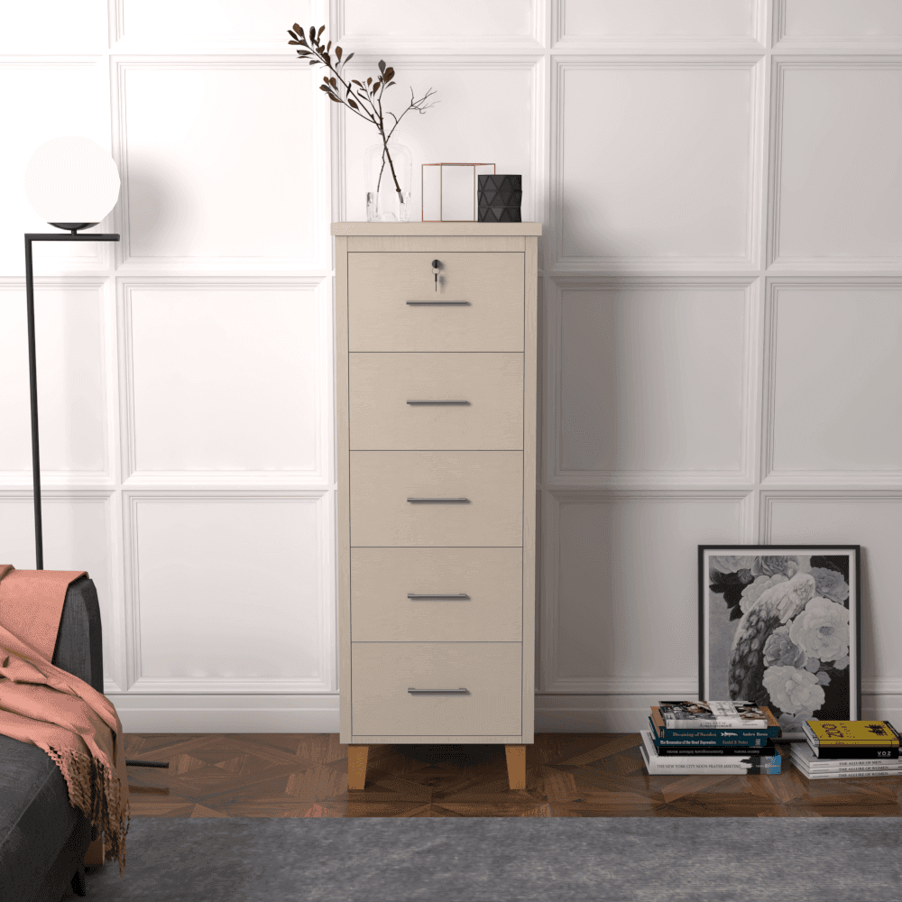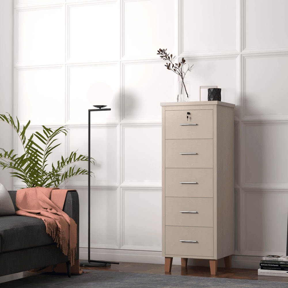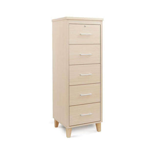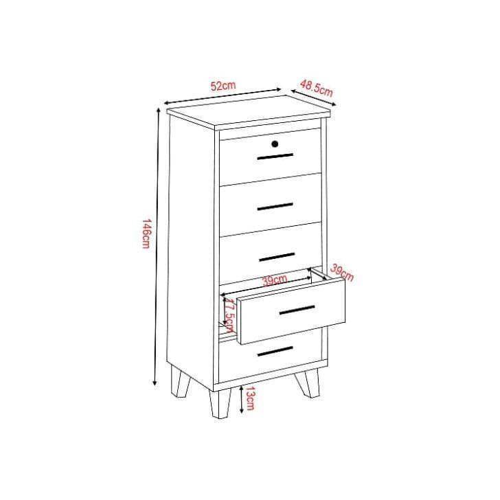 The Aler Chest of Drawer is a practical storage solution crafted from a durable MDF board. With five spacious drawers, it offers ample room to organise and store your belongings. Plus, each drawer is equipped with a convenient lock, providing added security for your valuables. Simplify your life with the functional and stylish Aler Chest of Drawer, designed to keep your space tidy and organised.