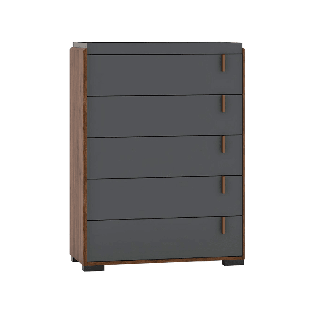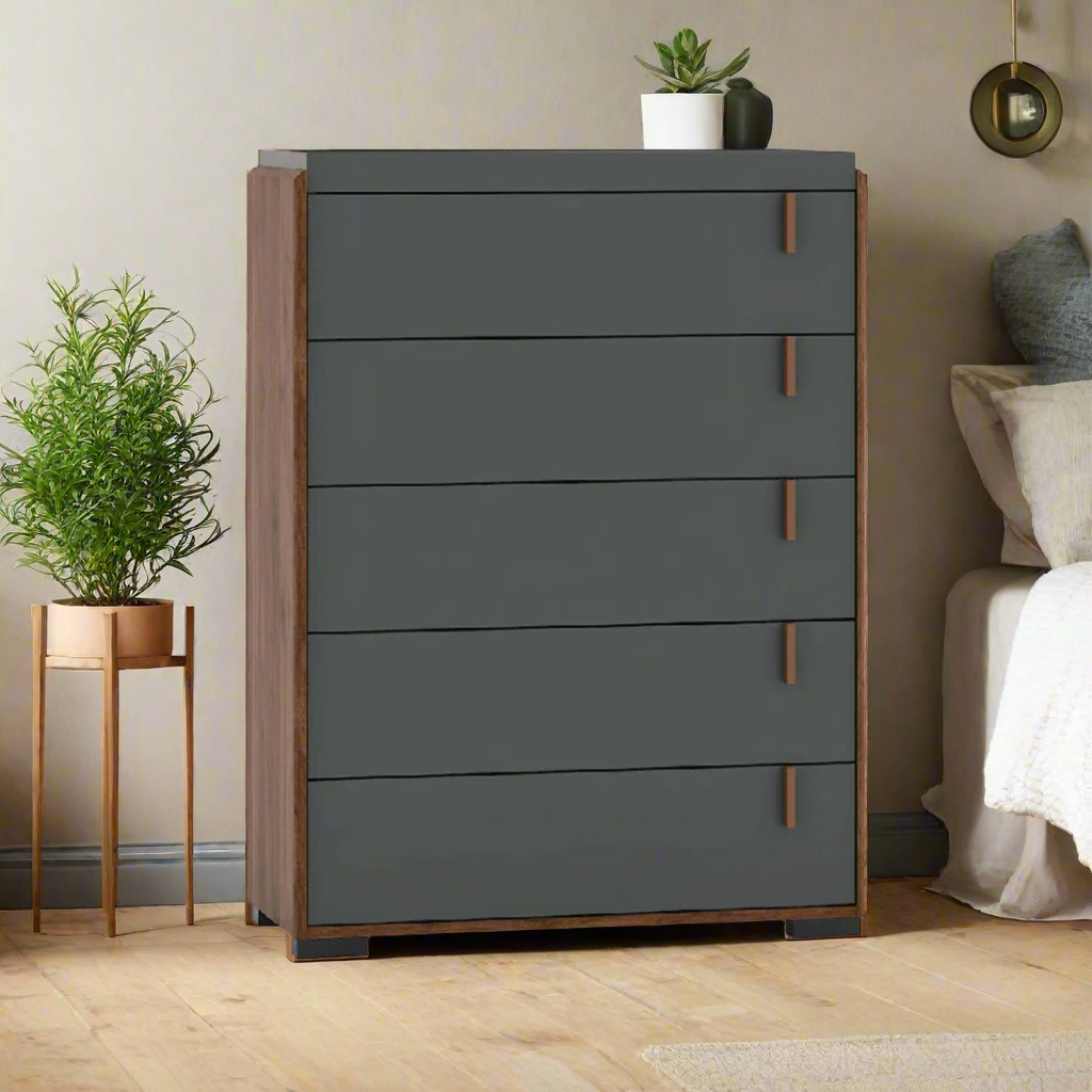 The Britton Chest of Drawers brings smart storage and contemporary design to your bedroom or living space. With its bold dark grey drawer fronts accented by a contrasting wooden frame and classic knobs, this piece makes a subtle yet stylish statement in any modern interior.