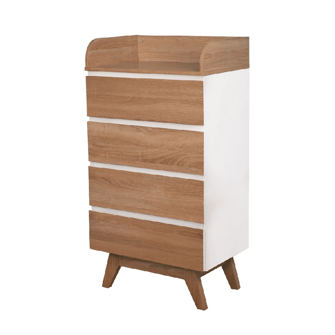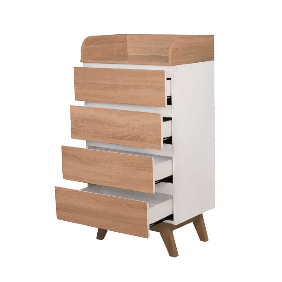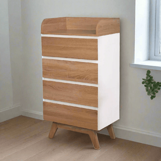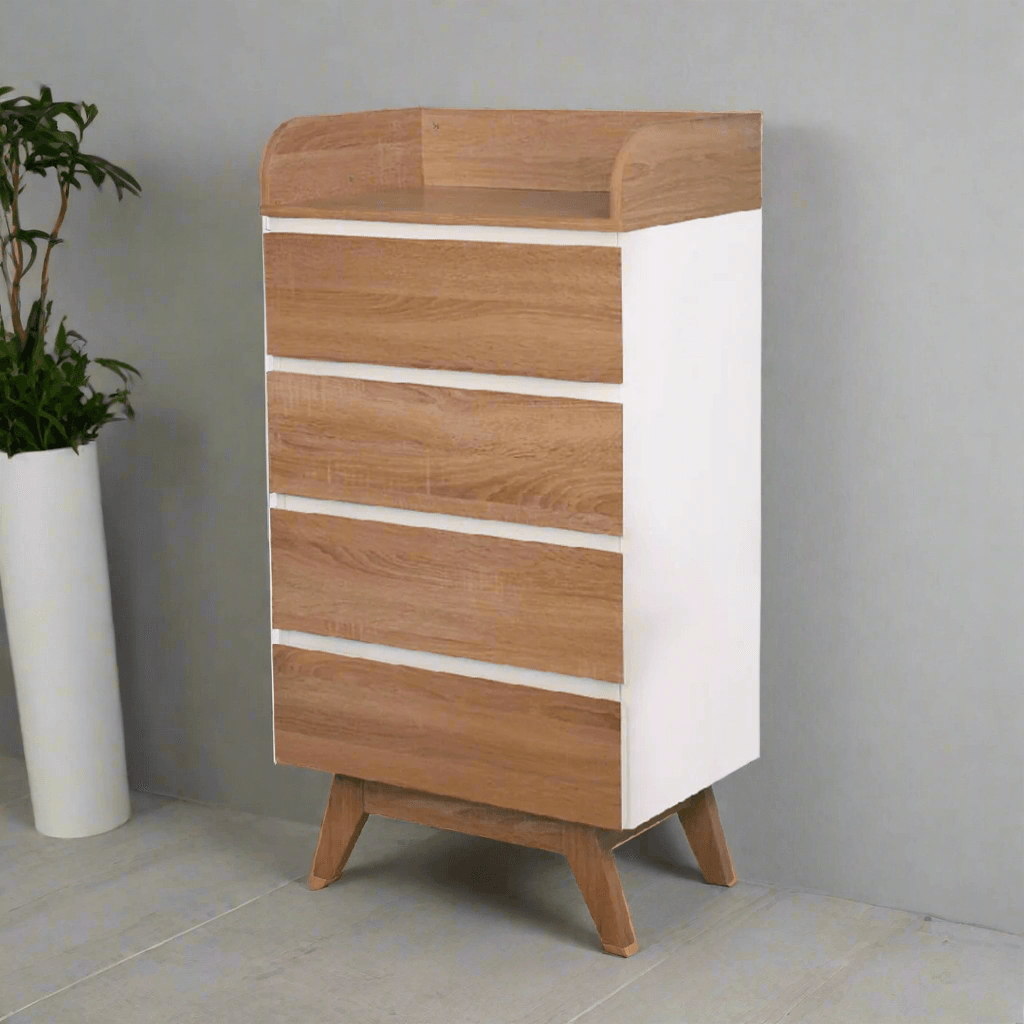 The Tillian Chest of Drawer offers compact yet stylish storage for bedrooms, dressing areas, or entryways. Featuring a clean white frame paired with oak-coloured drawers, this piece is crafted from durable particle board and designed with functionality in mind. The four drawers provide ample concealed storage, while the open shelf with raised sides keeps essentials accessible without falling off. Wooden legs elevate the unit for a lighter profile and easy cleaning underneath.