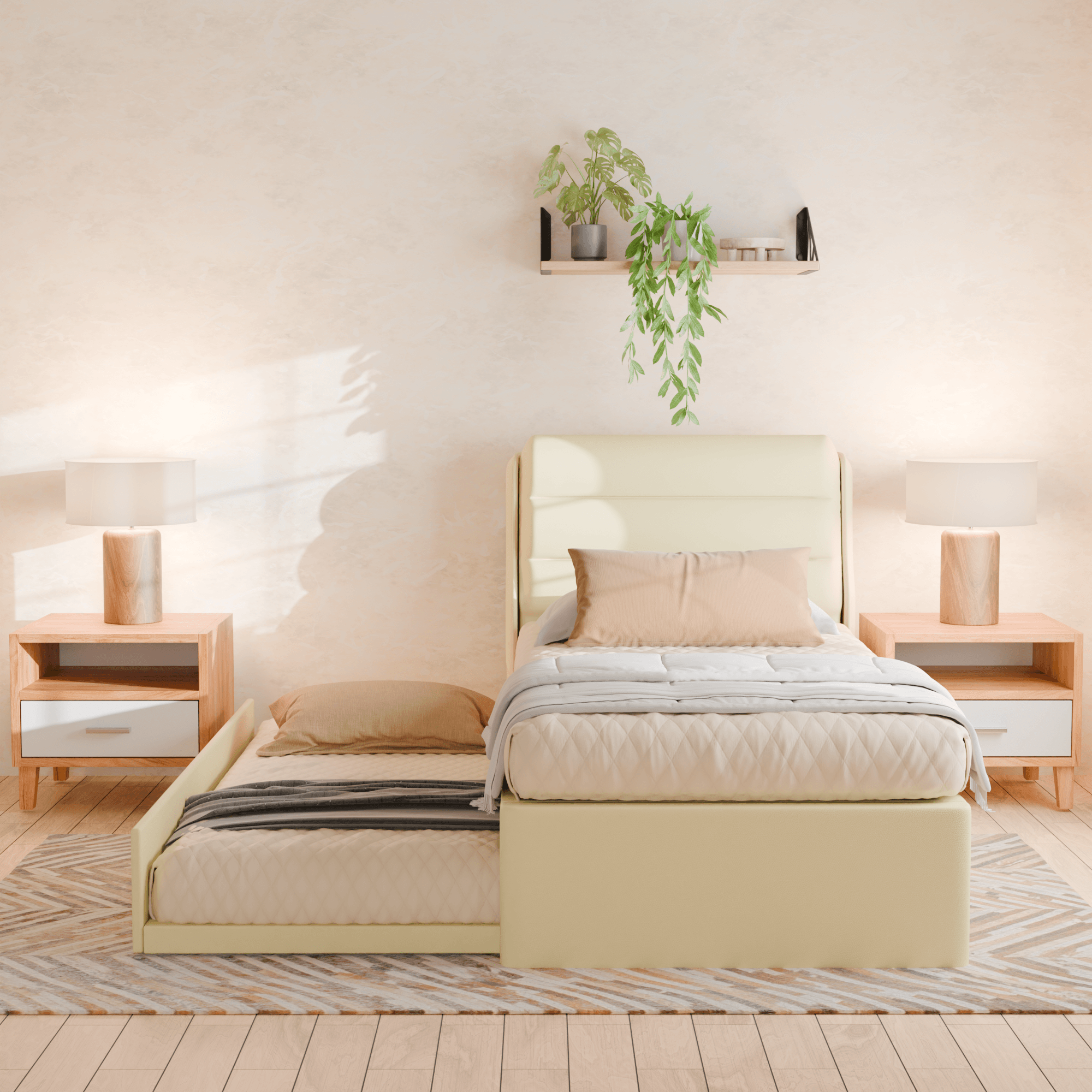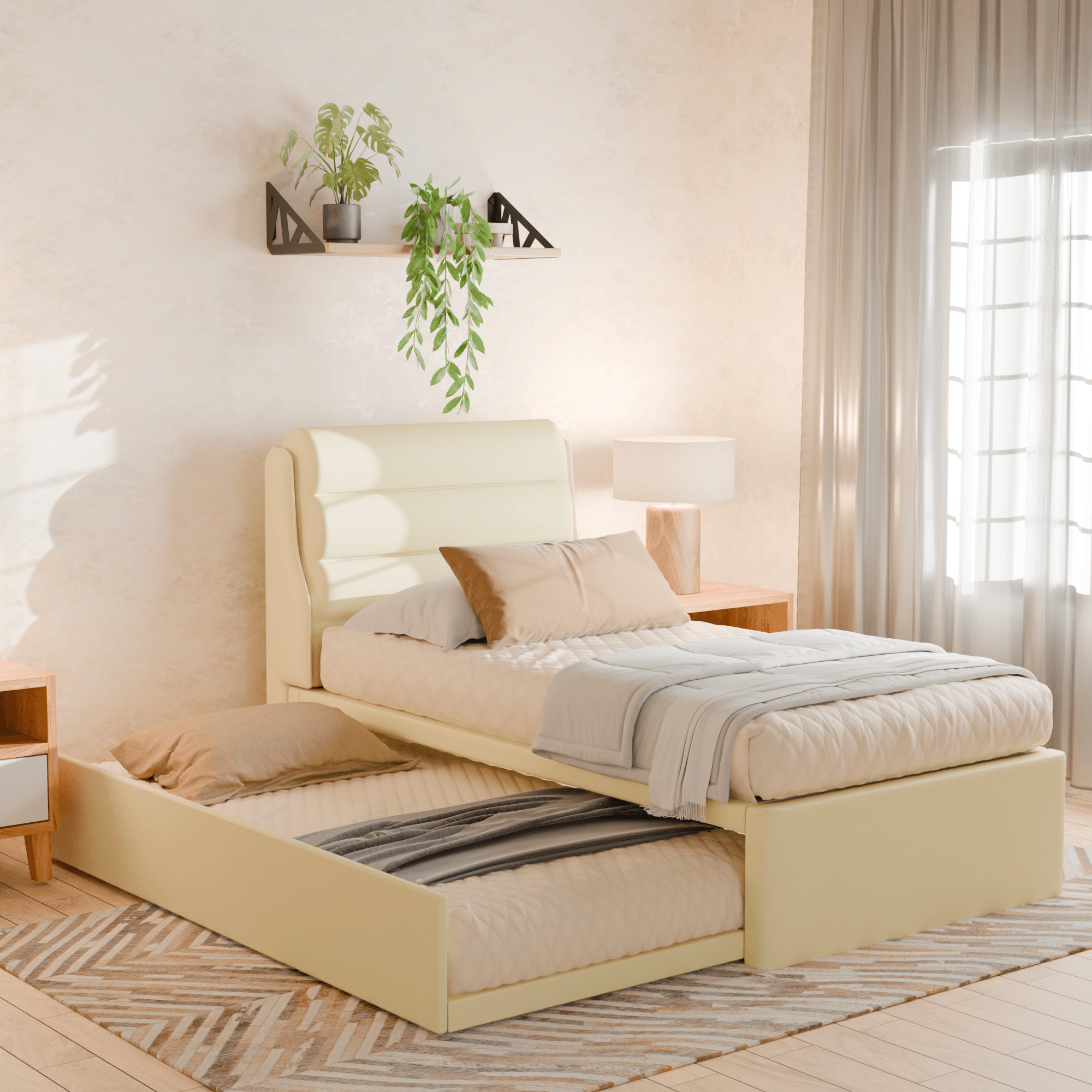 Trundle beds are some of the best solutions to maximise the use of your room. Ideal for guest rooms or shared rooms, this 3 in 1 faux leather bed will definitely help you make the most out of your limited space. Made with high-quality faux leather, carefully assembled frame, and cushioned headboard.
