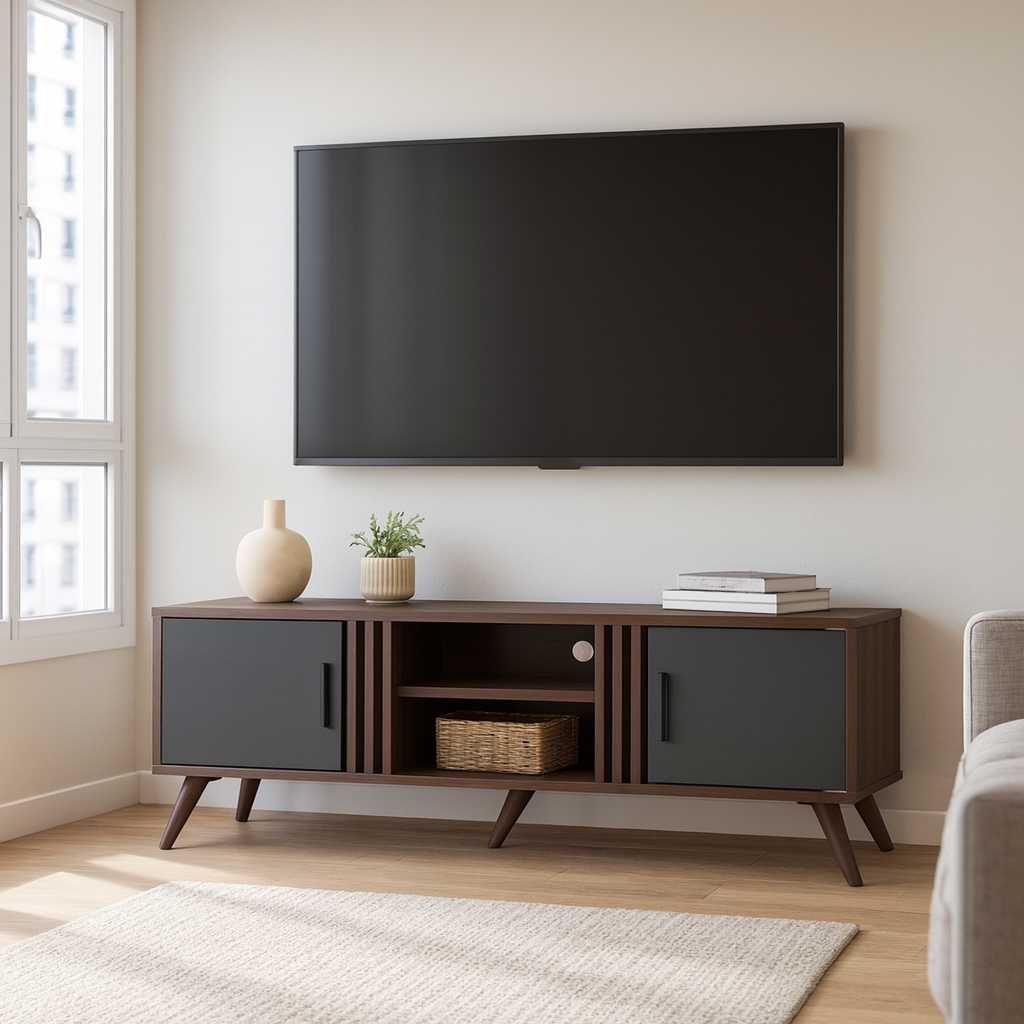 The Arqo TV Console (160cm) blends bold contemporary design with practical storage, making it a refined centerpiece for modern and mid-century inspired living rooms. Its dark walnut wood frame is beautifully paired with matte grey doors, creating a sleek two-tone contrast that exudes sophistication.
