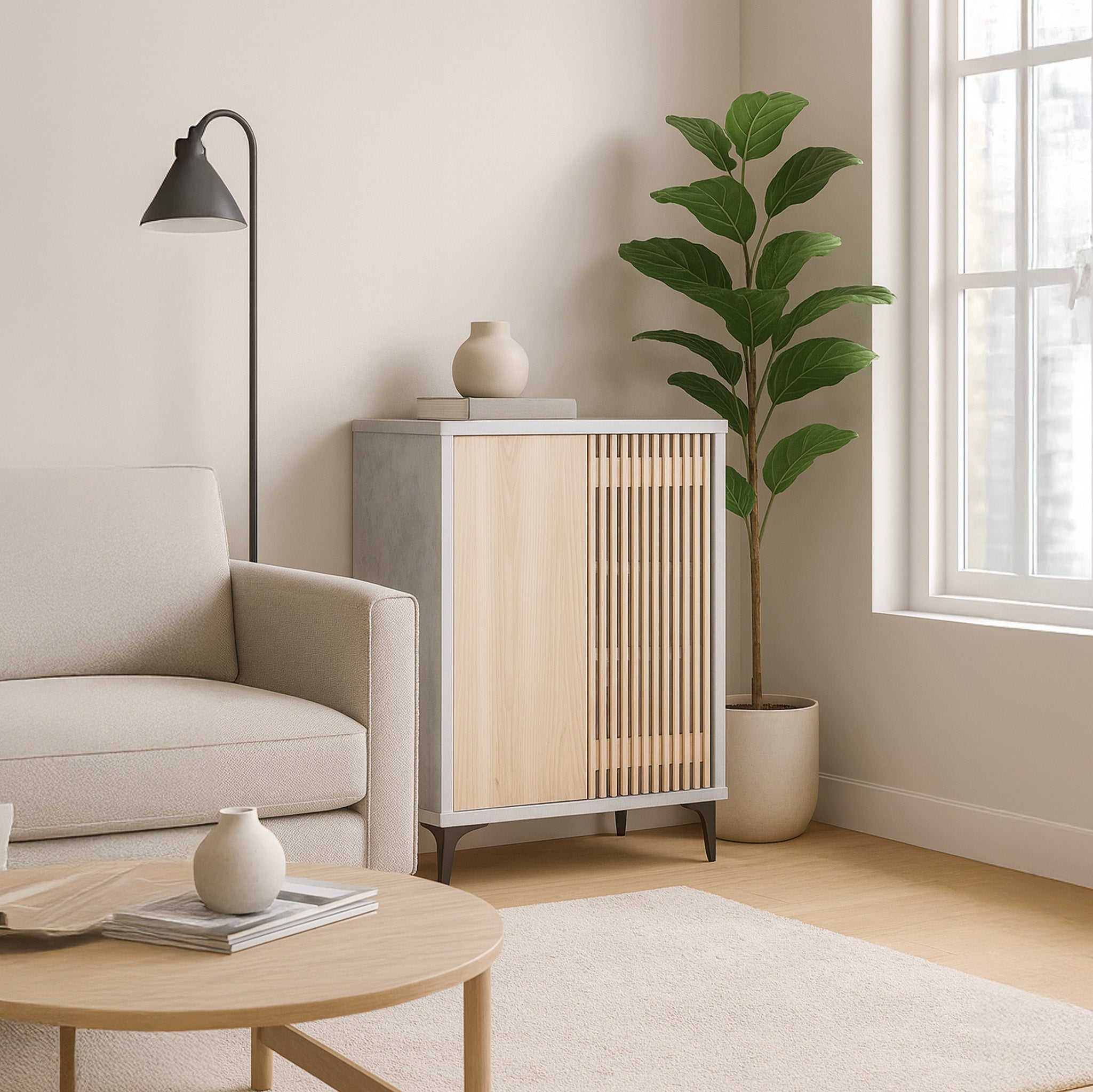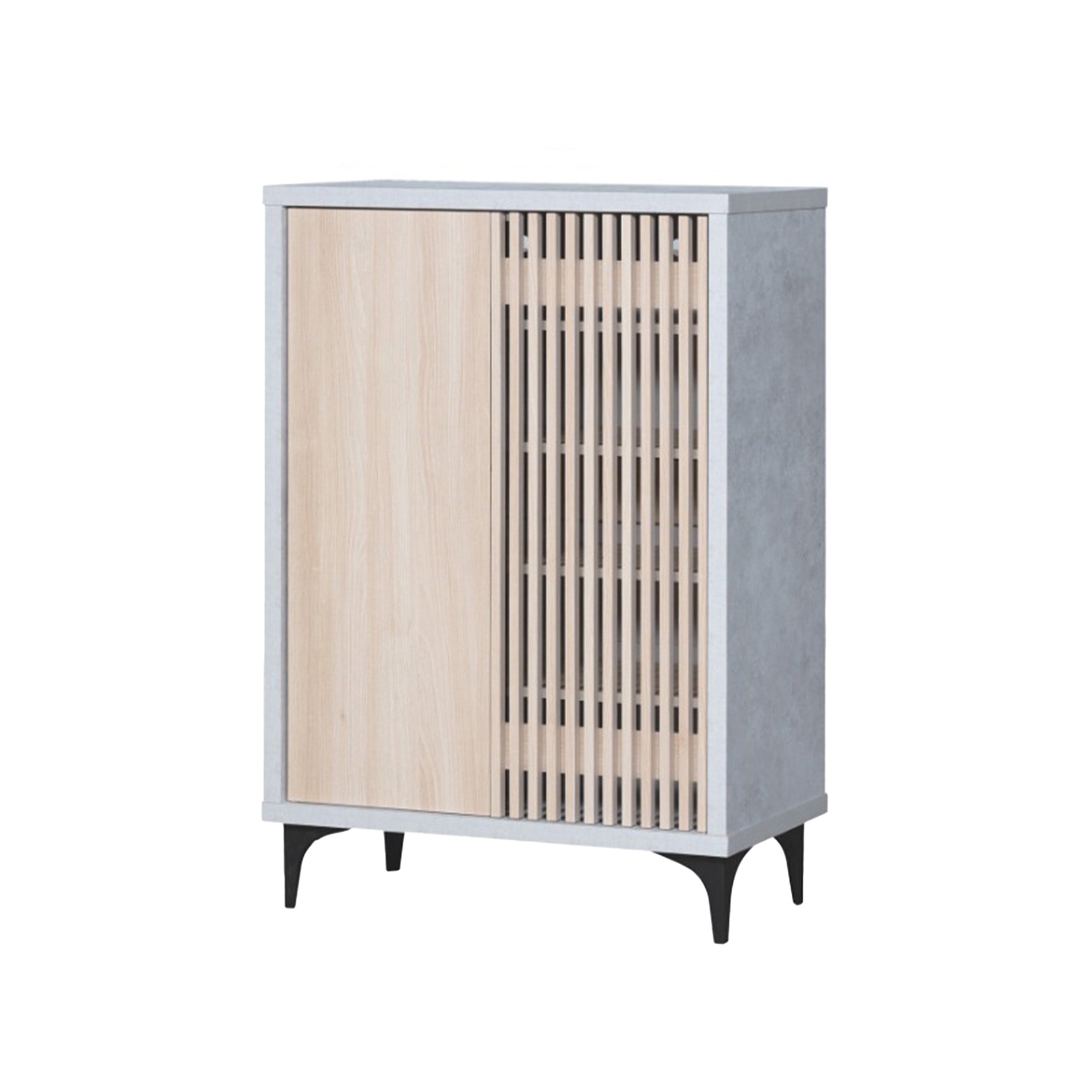 The Zyra 2 Door Shoe Cabinet (80cm) blends sleek minimalism with everyday practicality, making it a refined addition to any modern home. Its two-tone finish pairs a light natural wood front with a sleek grey frame, creating a clean and contemporary contrast. One door features a smooth wood panel, while the other showcases vertical slatted detailing, adding depth and visual sophistication.