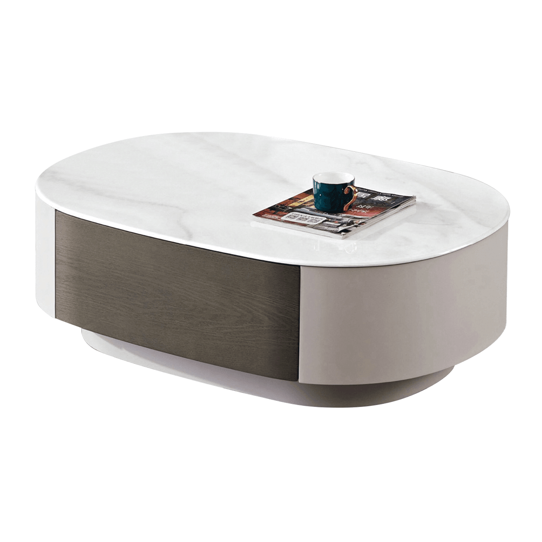 The Ciana Oval Coffee Table features a sleek Gloss White Granite Stone Top paired with a modern Matte Light Grey and Matte Dark Khaki finish. Two soft closing drawers add convenience to its contemporary aesthetic.
