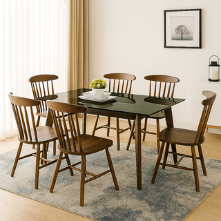 Elevate your dining experience with the Amorette Wooden Dining Set, designed to bring elegance and durability to your home. Featuring a sleek 10mm tempered glass table top supported by a solid wood frame, this set blends modern sophistication with timeless craftsmanship. The six matching wooden chairs offer both comfort and stability, making every meal a refined occasion.
