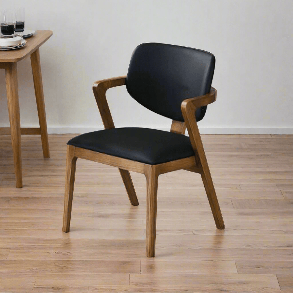 Elevate your dining experience with the Lolia Faux Leather Ash Wood Dining Chair. Designed for both style and durability, this chair features a black, pet-friendly faux leather that is scratch-resistant and easy to maintain. The sturdy ash wood frame ensures lasting stability, while the cushioned back and seat provide superior comfort.