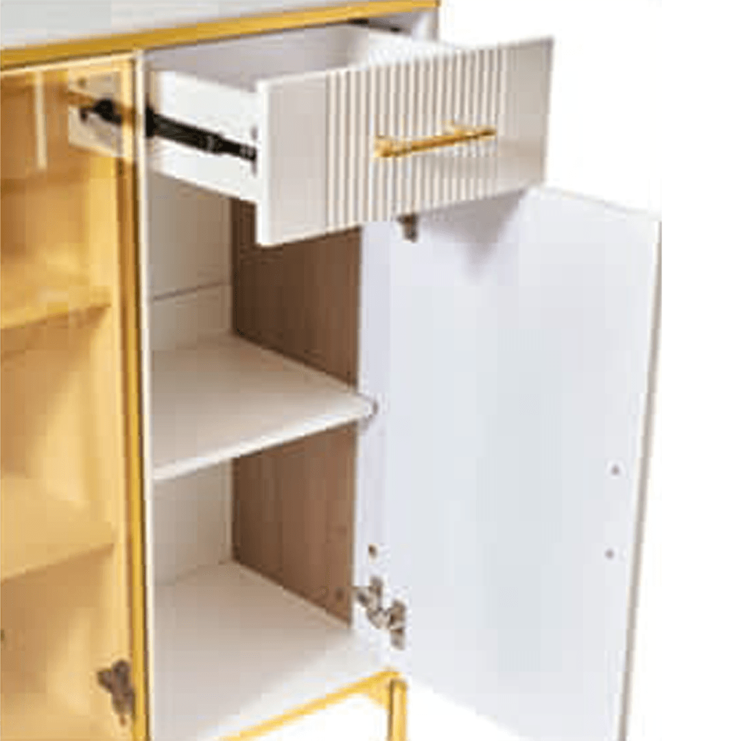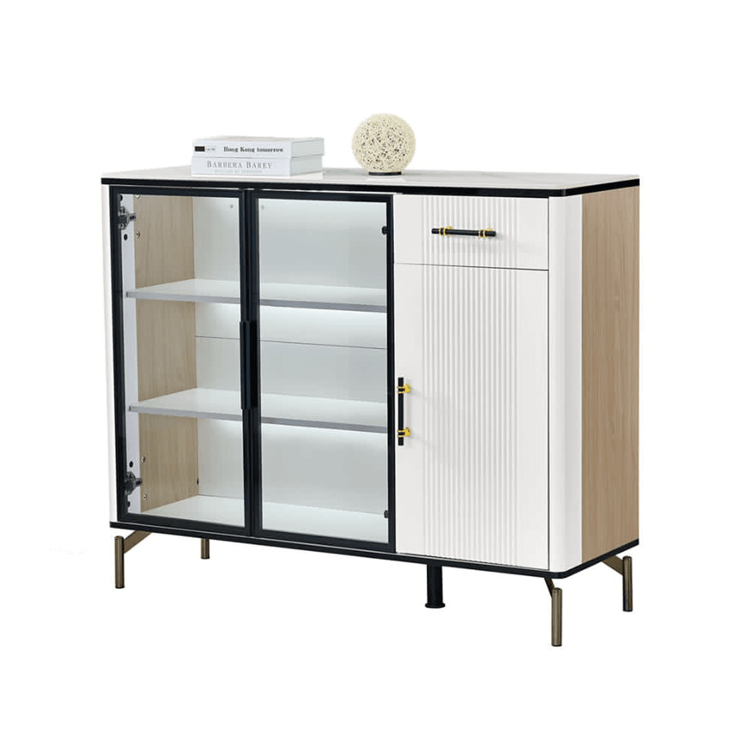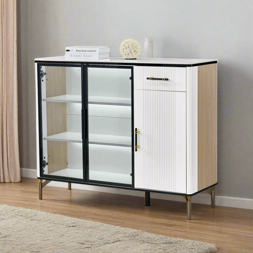 The Maurille II Buffet Hutch (120cm) brings sophistication to your dining or living space. With a durable sintered stone top, built-in sensor lighting, and elegant fluted panel detailing, this hutch effortlessly blends function and style. Available in black and gold, its sleek metal legs add a contemporary touch.