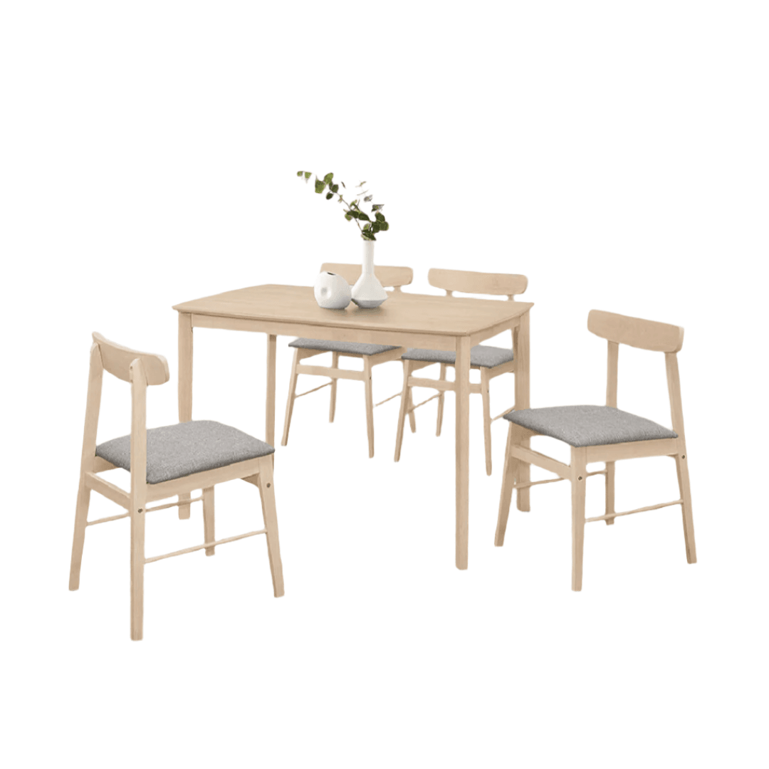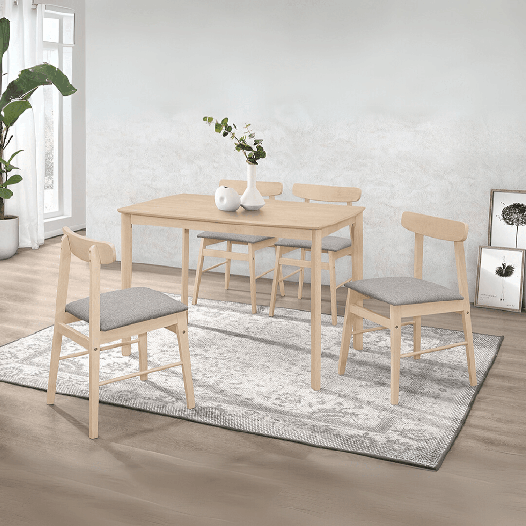 The Novara Wooden Dining Set brings a touch of charm and practicality to any dining area. Featuring a white-washed MDF tabletop with rubber wood veneer and sturdy solid wood legs, this 4-seater set is perfect for smaller dining spaces. The wooden dining chairs with soft grey fabric seat cushions provide both comfort and style, making it a great choice for casual meals and gatherings.