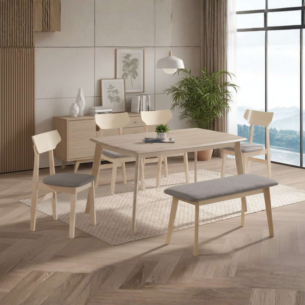 1 Wooden Dining Table + 4 Fabric Wooden Dining Chairs + 1 Fabric Wooden Dining Bench