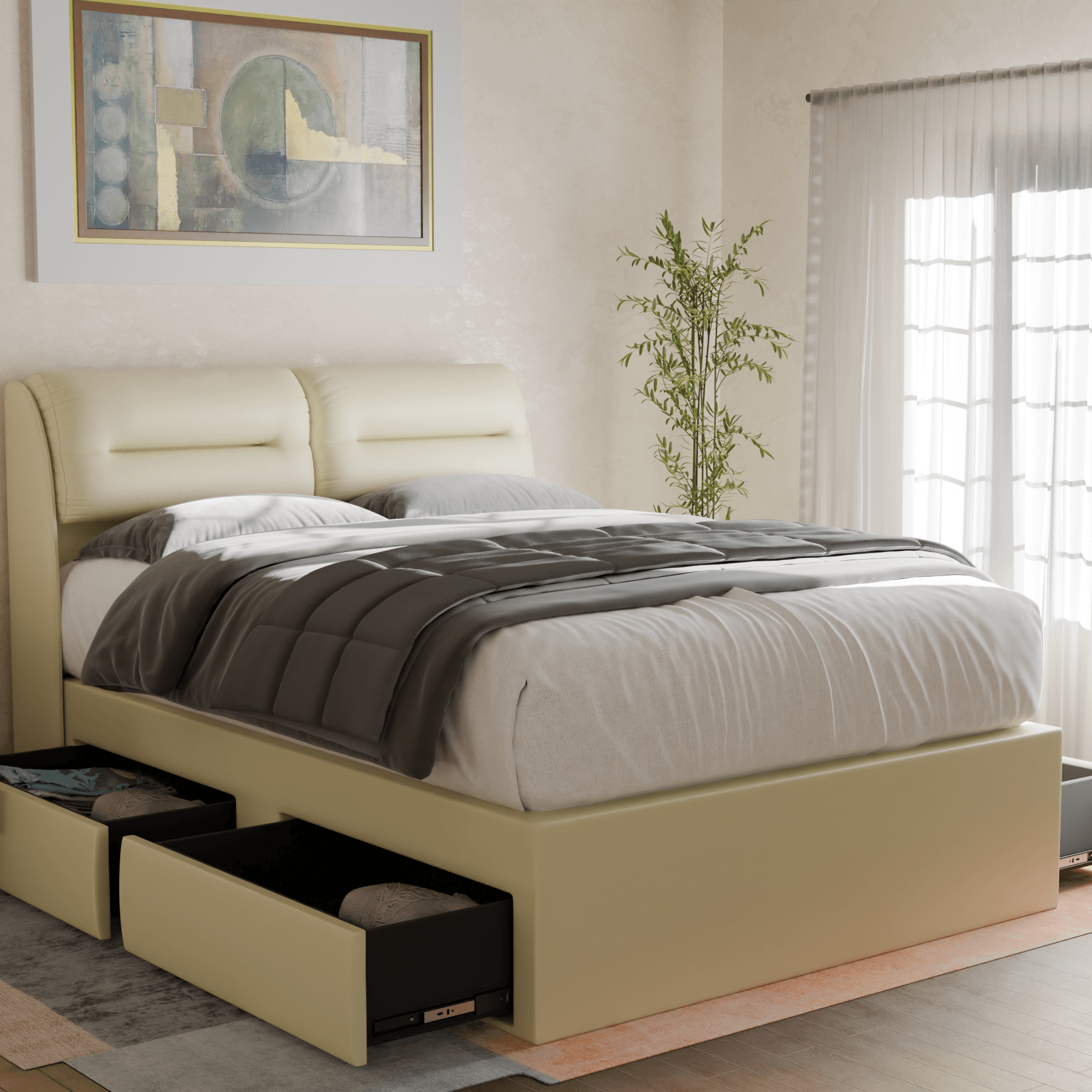 The Hanubee Faux Leather Drawer Bed is a luxurious and tasteful addition to any bedroom. Expertly crafted with premium faux leather, this bed combines style and functionality with built-in drawers for extra storage space. Transform your bedroom into a sophisticated and exclusive retreat with this elegant piece.