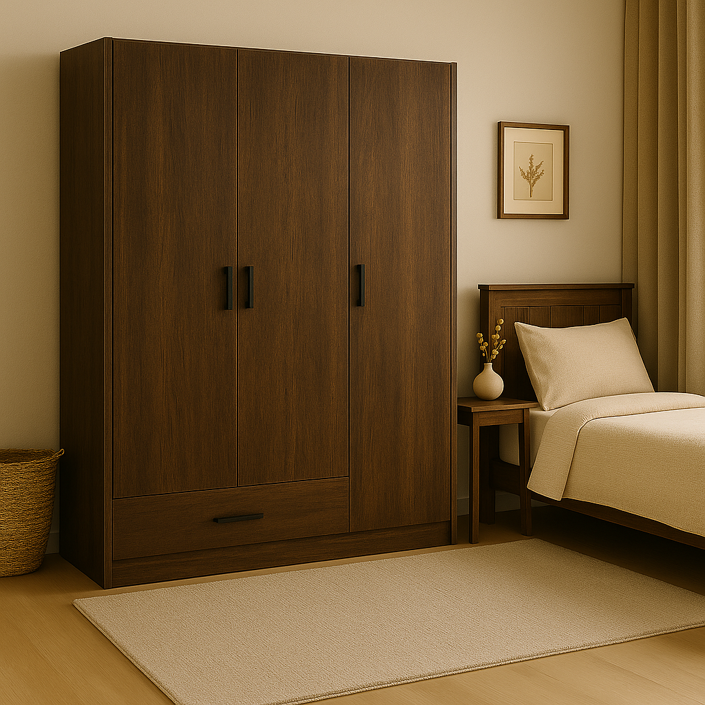 The Elora 3 Door Wooden Wardrobe is your ideal storage companion—designed for modern homes that need functionality without sacrificing style. Finished in a rich dark brown wood tone, this wardrobe delivers both visual warmth and practical storage in a slim silhouette, perfect for HDB bedrooms and condominium rooms in Singapore.
