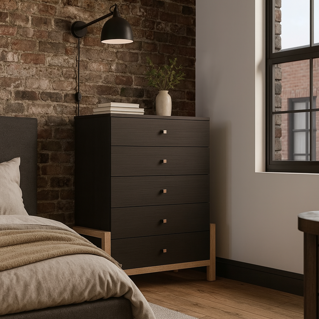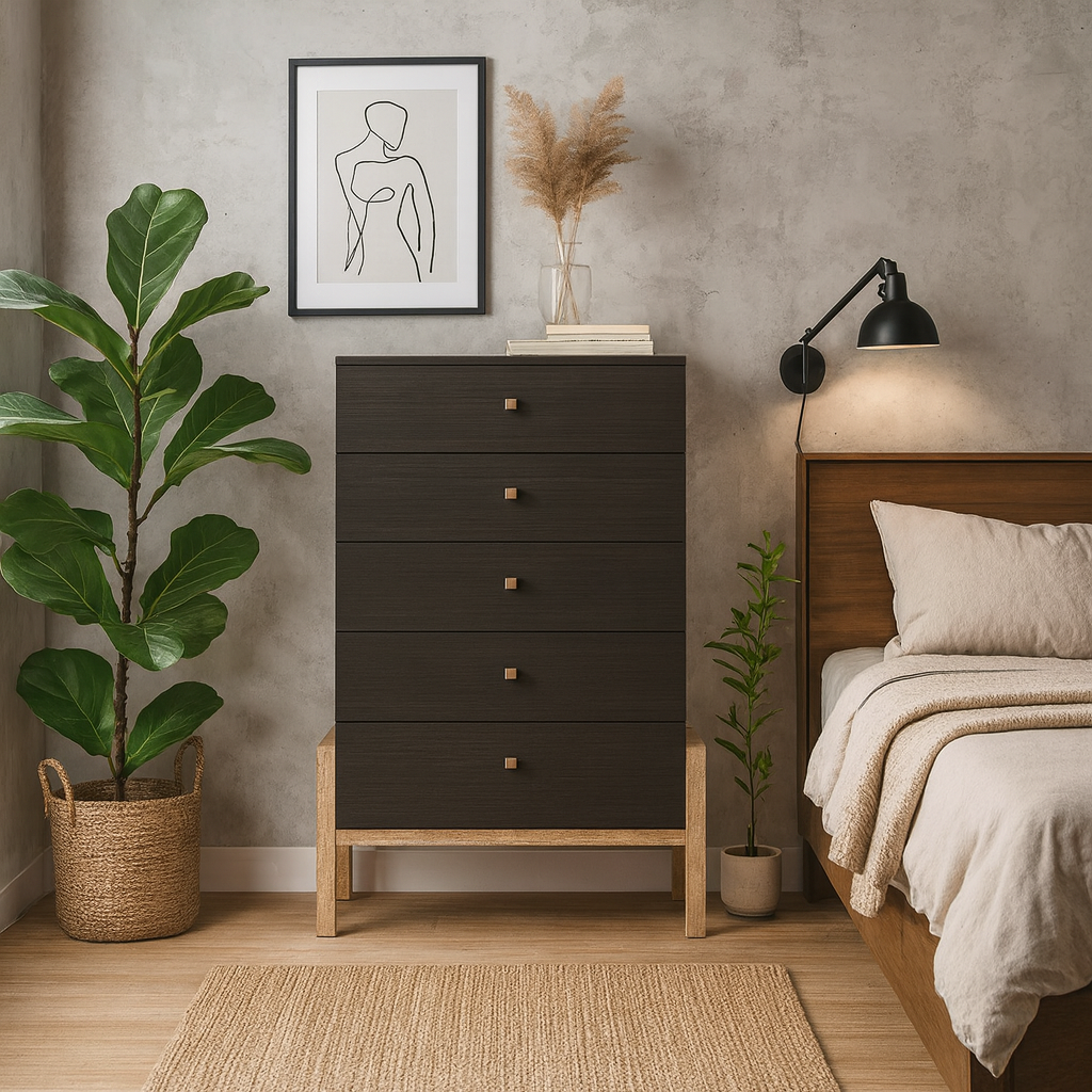 The Vireo Wooden Chest of Drawer offers practical vertical storage wrapped in a sleek, modern design. Crafted from particle board in a rich walnut finish, it features five spacious drawers for organizing clothes, linens, or daily essentials. Light-colored wooden legs provide a subtle contrast and visual lift, while the round knobs add a clean, understated charm.