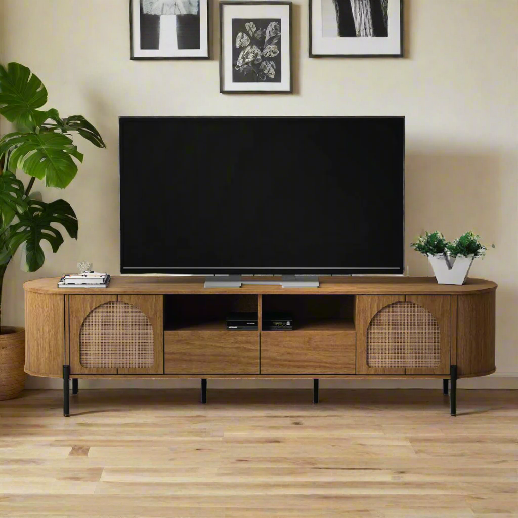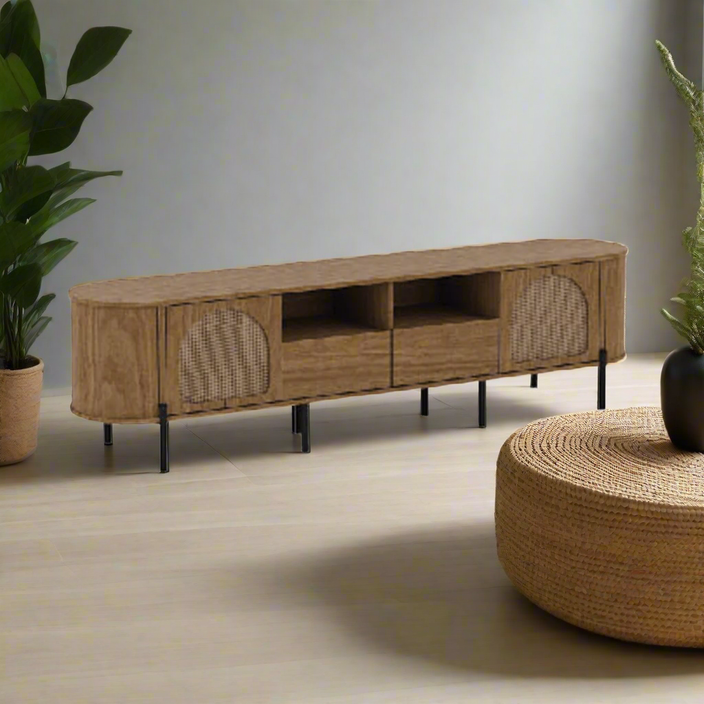 The Zoya Rattan TV Console (200cm) embodies Scandinavian aesthetics with a warm blend of natural textures and clean design. Built from sturdy particle board and supported by sleek black metal legs, this TV console offers a practical yet stylish centerpiece for your living room. With 2 closed door storage compartments, 2 open shelves, and 2 drawers, it provides versatile storage for media devices, accessories, and decorative pieces, while the woven rattan panels add a touch of rustic charm.