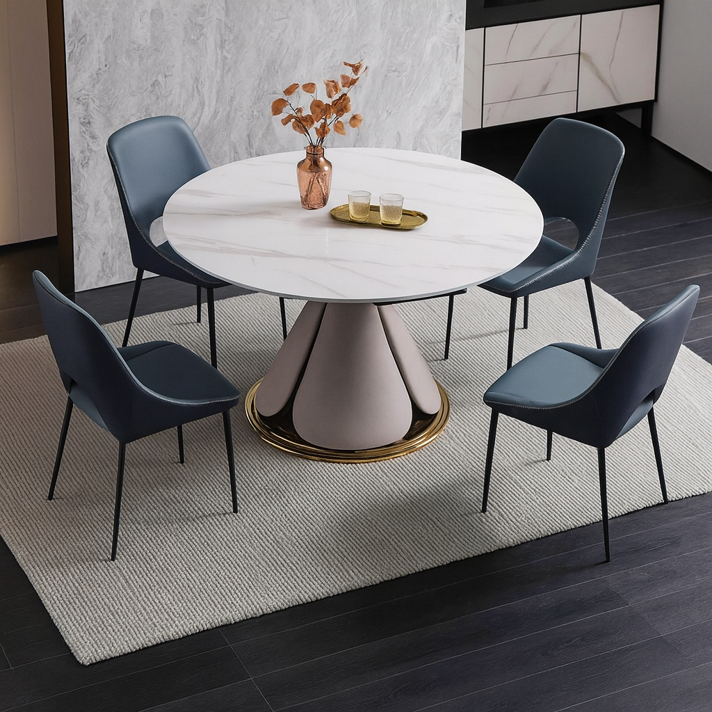 The Nekka Round Sintered Stone Dining Table is a refined centerpiece designed for modern living. Its sleek sintered stone top features elegant marble-inspired veining, offering a balance of beauty and durability. Supported by a sculptural pedestal base with a golden accent ring, this table exudes sophistication while ensuring long-lasting stability.