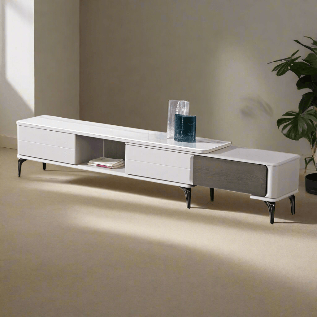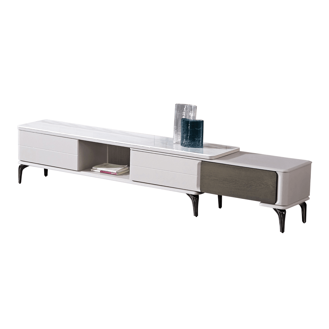 This Ciana Extendable Tv Console includes a stunning gloss white granite stone top, along with a combination of matte light grey and matte dark khaki finishes. It also features 3 soft closing drawers for added convenience.