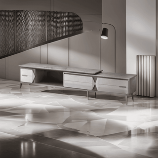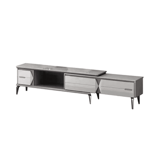 Elevate your living space with the Dolores Glossy Sintered Stone Extendable TV Console. Its sleek design features a glossy sintered stone top, complemented by a sturdy MDF structure finished in grey. The console is supported by chic metal legs, adding a modern touch to your interior. With its extendable feature, it effortlessly adjusts to accommodate your needs, stretching up to 220cm. Organise your essentials neatly with two soft-closing drawers and one open-door storage compartment.