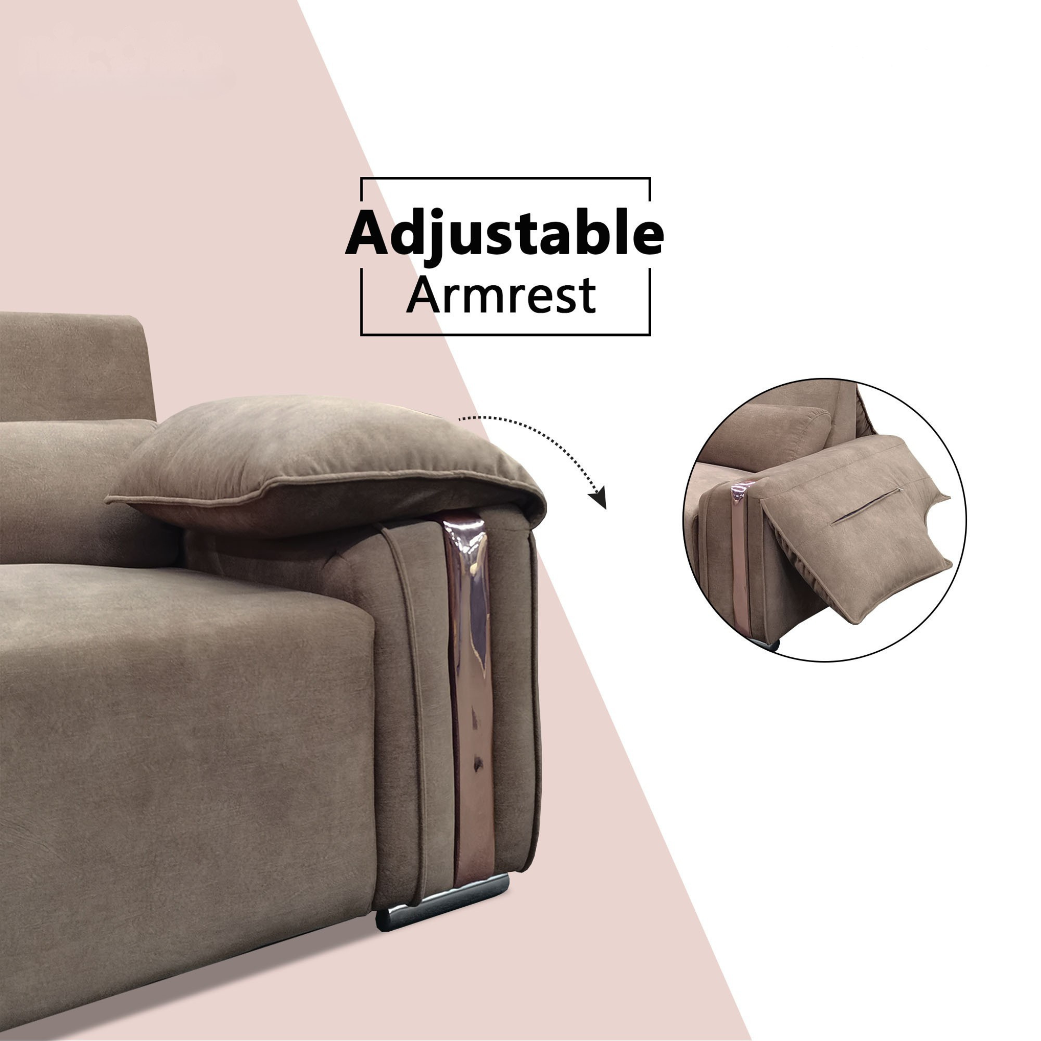 Designed for flexibility, its adjustable armrests allow you to tailor the support for upright seating, lounging, napping, or casual relaxation. The plush cushioning, smooth contours, and warm beige upholstery create a welcoming, understated elegance. Subtle rose-gold accent trims along the armrest edges add a touch of luxury without overpowering the design.