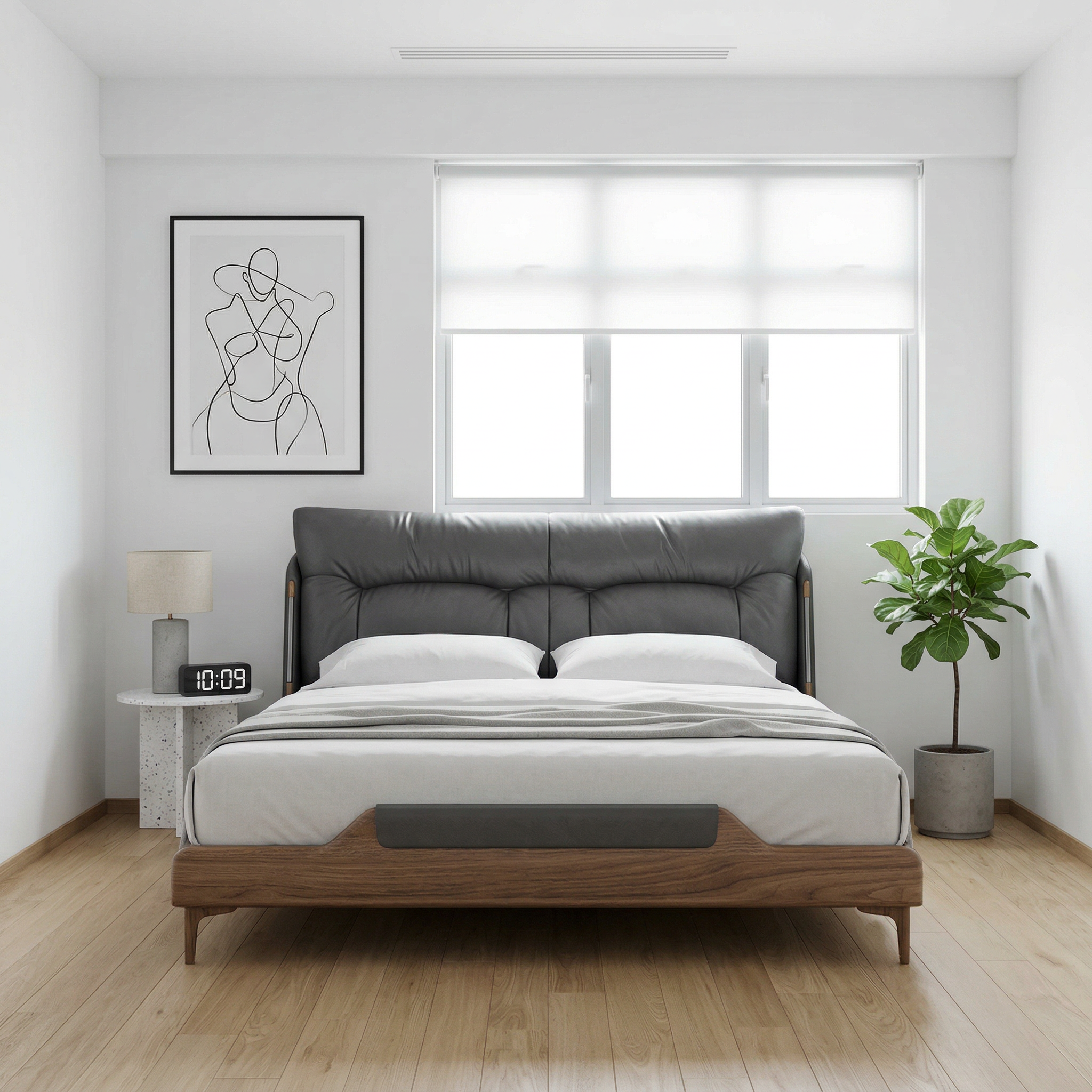 The bed is enhanced with ash wood side panels, adding natural warmth and visual contrast to the smooth leather upholstery. This combination of premium wood and leather materials creates a balanced design that feels both modern and timeless, elevating the bed’s overall aesthetic.