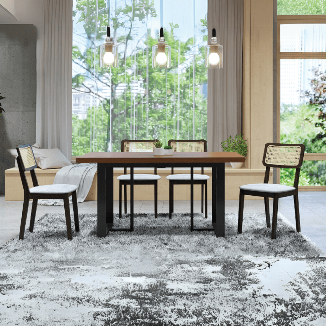Elevate your dining space with the Gideon Wooden Dining Set, where natural textures meet industrial elegance. This set features a robust 50mm thick rubberwood tabletop supported by sleek black metal legs, paired with six solid wood chairs boasting stylish rattan backrests. Whether hosting a dinner party or enjoying everyday meals, this set offers the perfect blend of durability and sophistication.