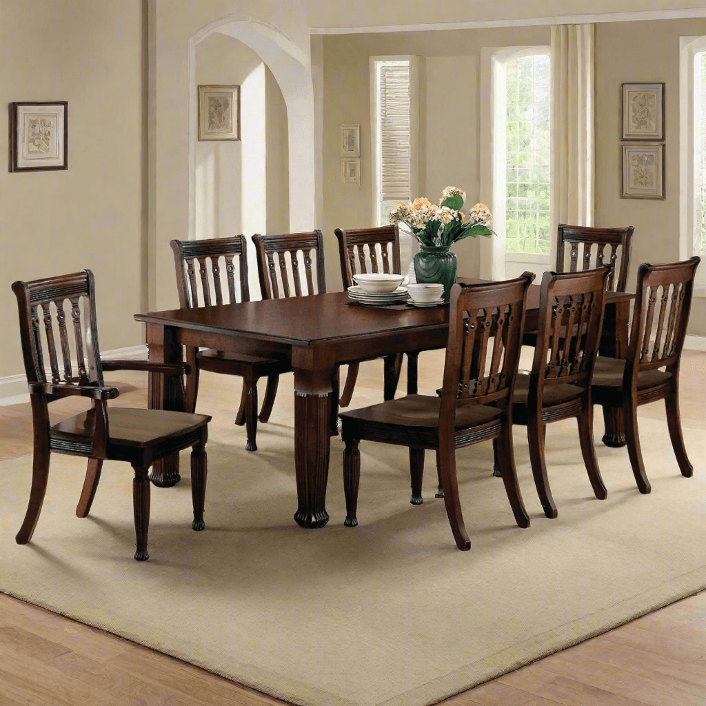 The Leocadia Wooden Dining Set (1+8) is a timeless addition to any home. Featuring classic silhouettes and a rich walnut finish, this set combines traditional charm with everyday function. The inclusion of 2 dining chairs with armrests adds a touch of distinction, making it ideal for both casual meals and formal gatherings.