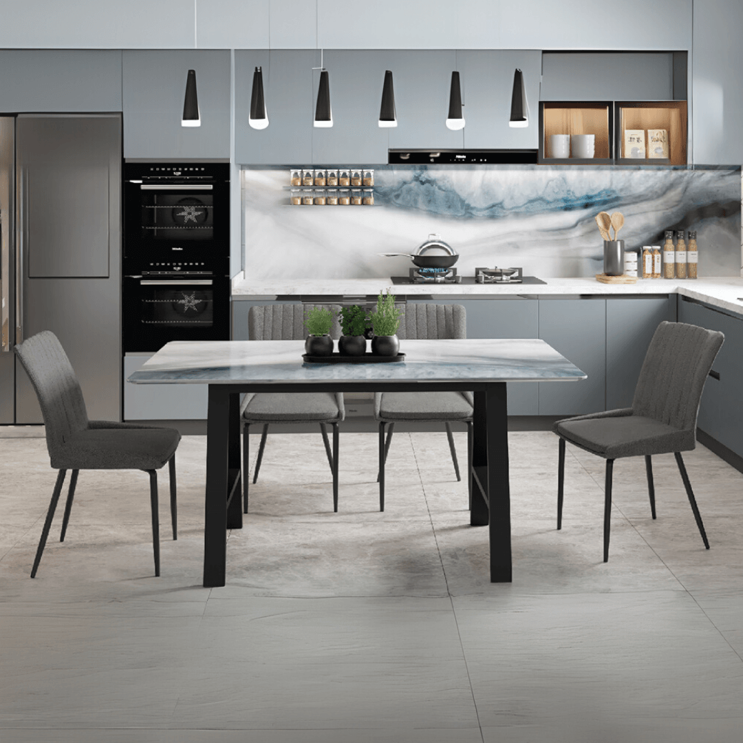 Designed to elevate your dining space, the Varek Marble Dining Set delivers a sleek and modern aesthetic with luxurious materials. A cultured marble table top rests on clean black metal legs, paired with soft fabric dining chairs for a comfortable, contemporary experience.