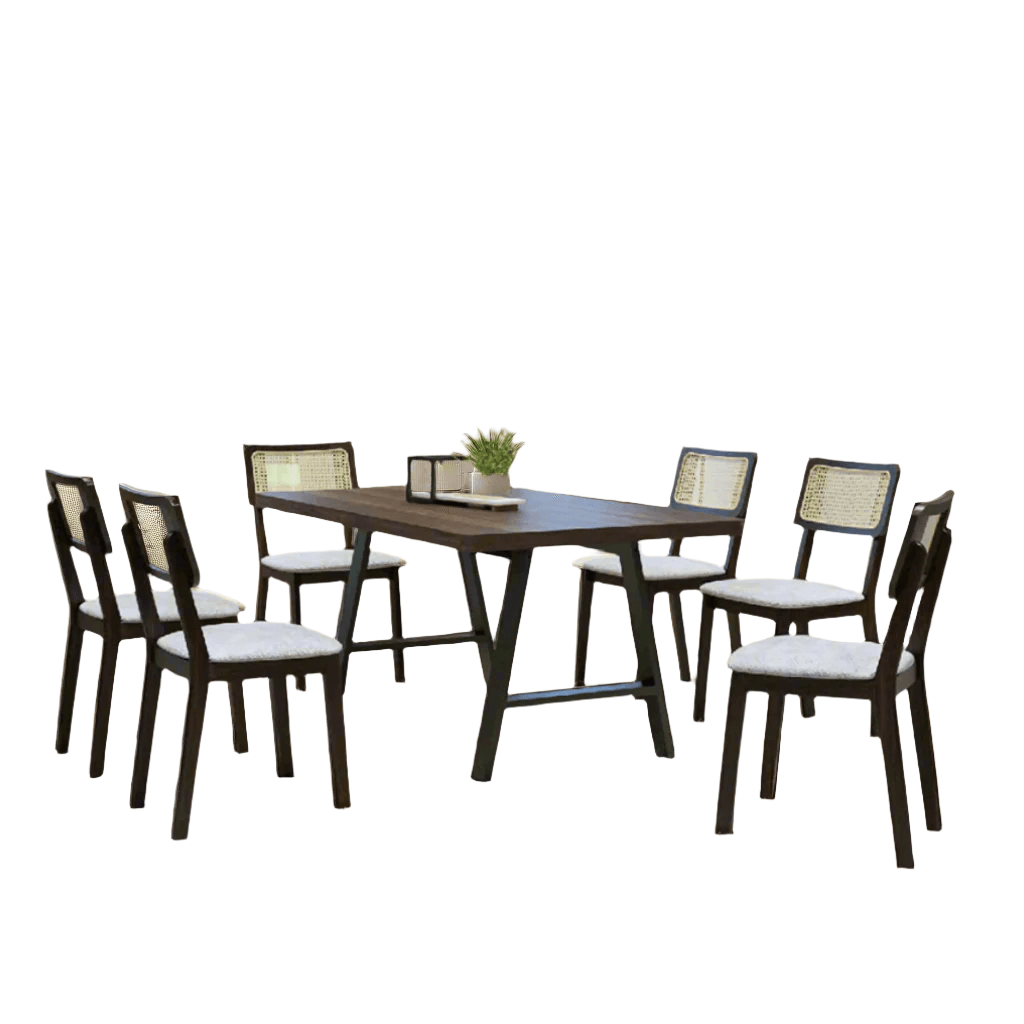 Each chair features a solid wood frame, rattan backrest, and soft fabric seat cushion—blending timeless craftsmanship with a relaxed, breathable look. Ideal for contemporary homes that value detail and texture.