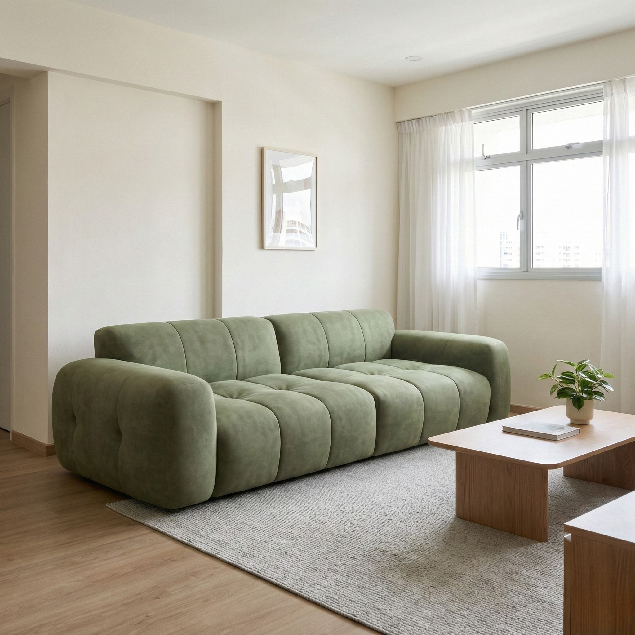 The Quen Fabric Sofa is upholstered in luxurious snowflake velvet, offering a soft suede-like touch with a refined matte finish. Its rich sage green tone reflects light beautifully, creating subtle tonal depth that elevates contemporary interiors with warmth and understated elegance.