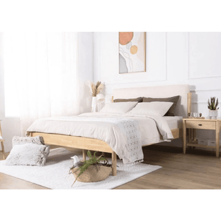 The essence of Japandi lies in simplicity. Keep the overall bedroom décor uncluttered, opting for a minimalist approach. Choose a neutral colour palette. Think whites, greys, and natural wood tones—to create a serene backdrop for your bed frame.