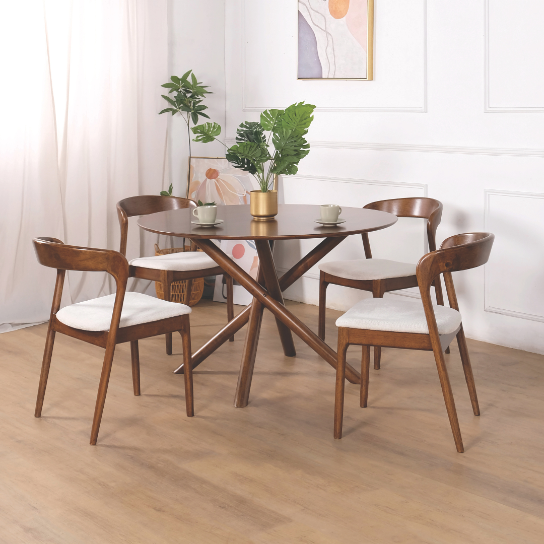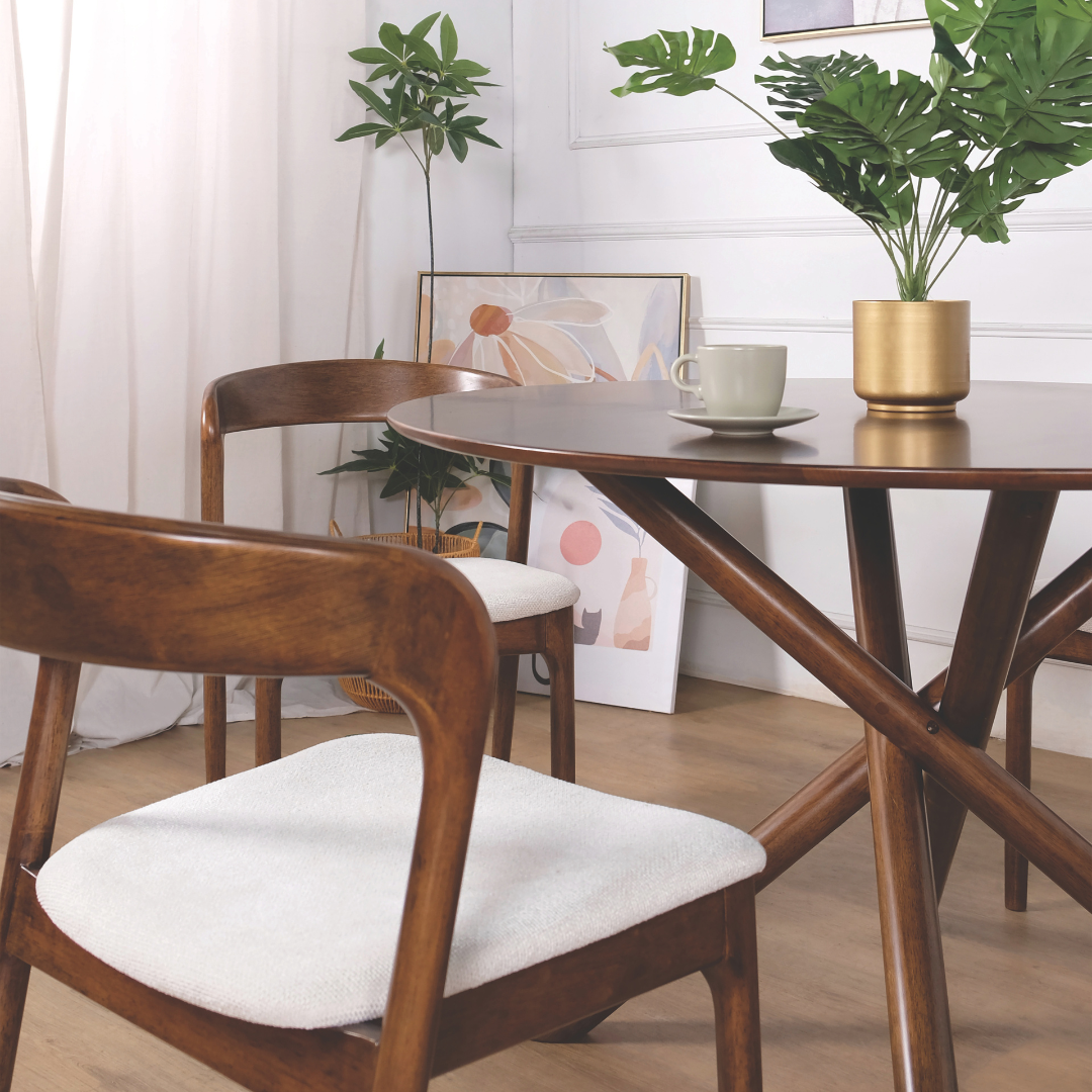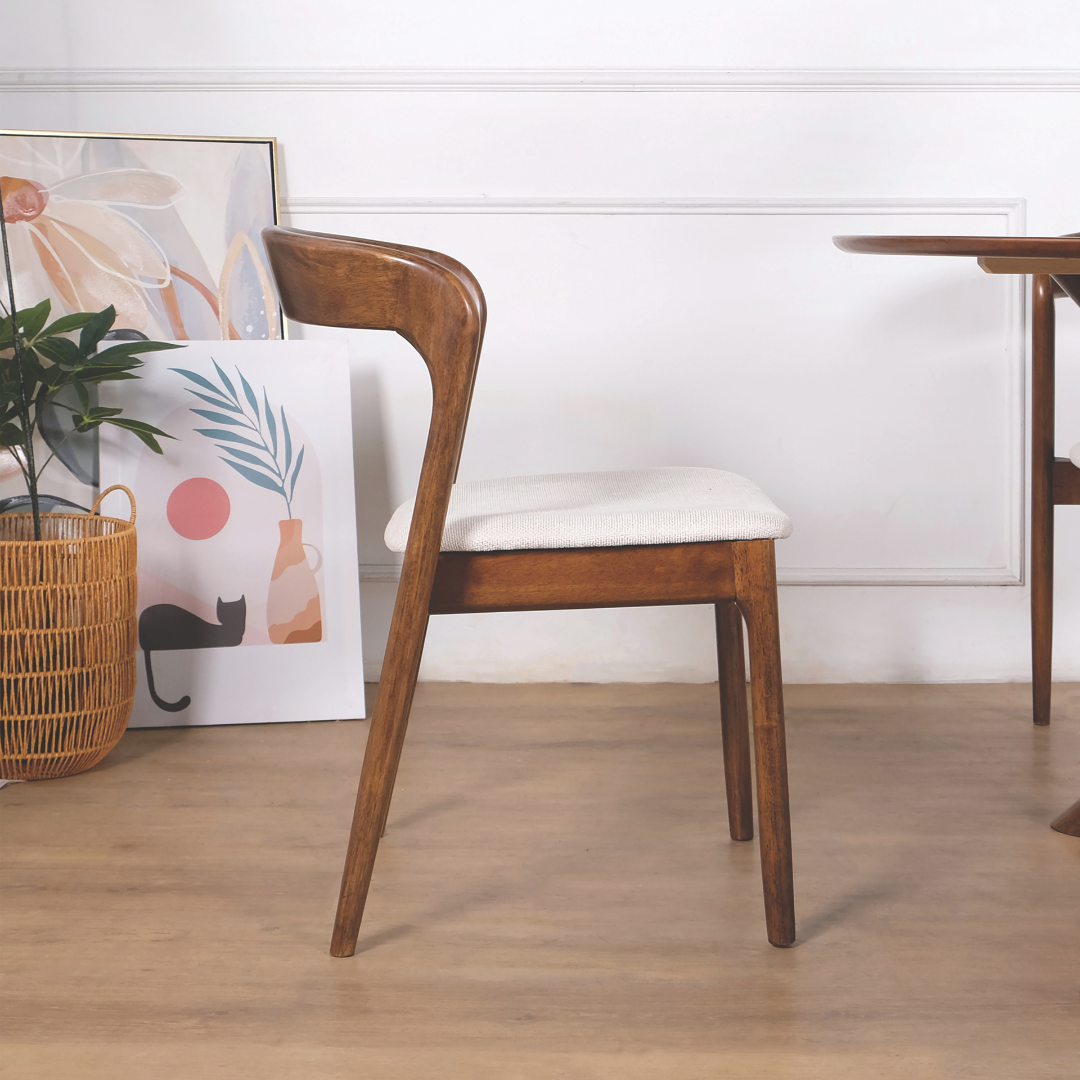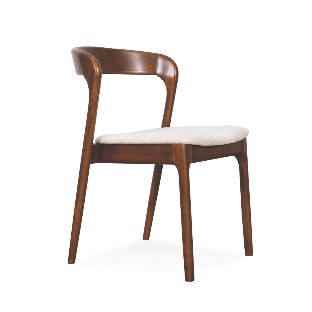Available in two distinct finishes—a warm, inviting Natural Wood and a rich, sophisticated Walnut—the Gubee adapts to your unique interior style. The plushly padded seat is upholstered in a soft, breathable light-grey fabric that ensures long-lasting comfort during dinner parties or morning coffee. Whether you are furnishing a compact HDB dining nook or an expansive condo open-plan space, its splayed, tapered legs and sculptural form add a sense of movement and "quiet luxury" to your home.