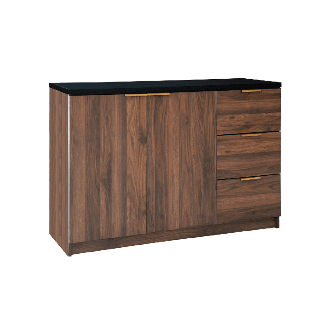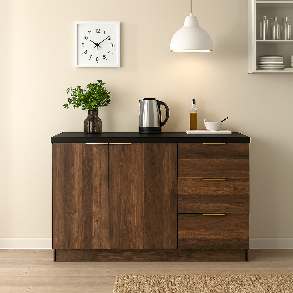 Designed for urban homes in Singapore, the Valor Junior Kitchen Cabinet delivers stylish storage in a compact form. Crafted from high-quality particle board with double-side lamination, it features a beautiful woodgrain finish paired with a sleek black countertop—perfect for small appliances, prep work, or display.