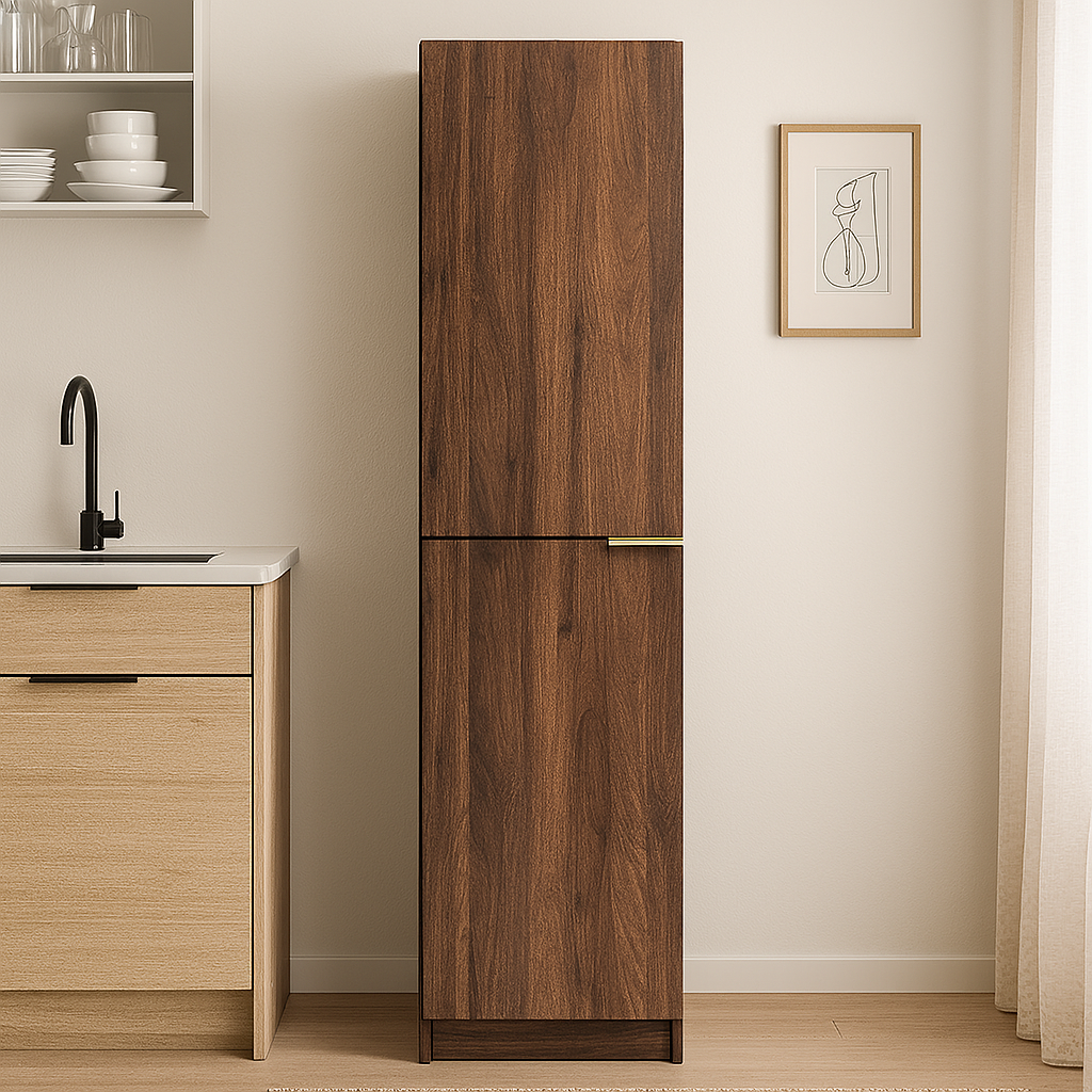 Made from sturdy particle board with double-side lamination and a 25mm thick PVC membrane press top, this cabinet provides a stylish and long-lasting pantry solution. Behind its 2 soft-close doors are 4 shelves—ideal for storing dried goods, condiments, kitchenware, or cleaning essentials.