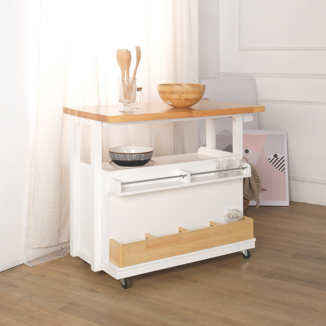 The Ayla Kitchen Trolley is a multi-functional powerhouse designed to solve the storage challenges of modern Singaporean living. Blending a crisp white frame with warm natural wood accents, this trolley provides a substantial additional countertop for meal prep, coffee brewing, or serving. Its thoughtful 360-degree accessibility makes it an ideal mobile island for HDB kitchens and open-plan condo dining areas.