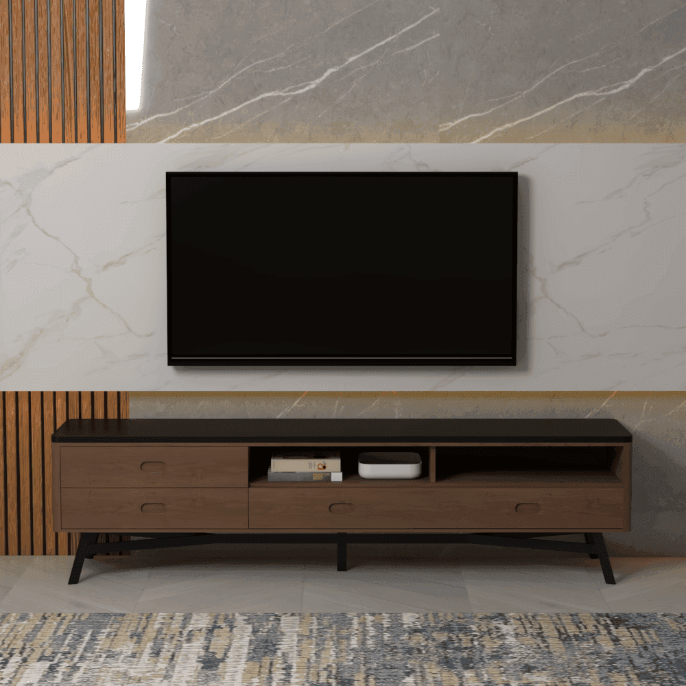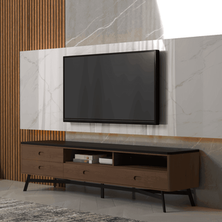 Elevate your home entertainment experience with the Bellevue Lava Stone TV Console. This console combines functionality with a modern design with three spacious drawers and a sleek lava stone top. Enjoy effortless access to your media essentials with smooth drawer tracks while the fixed metal legs provide stability and style. Personalise your living space with this sophisticated addition, perfect for any contemporary interior setting.
