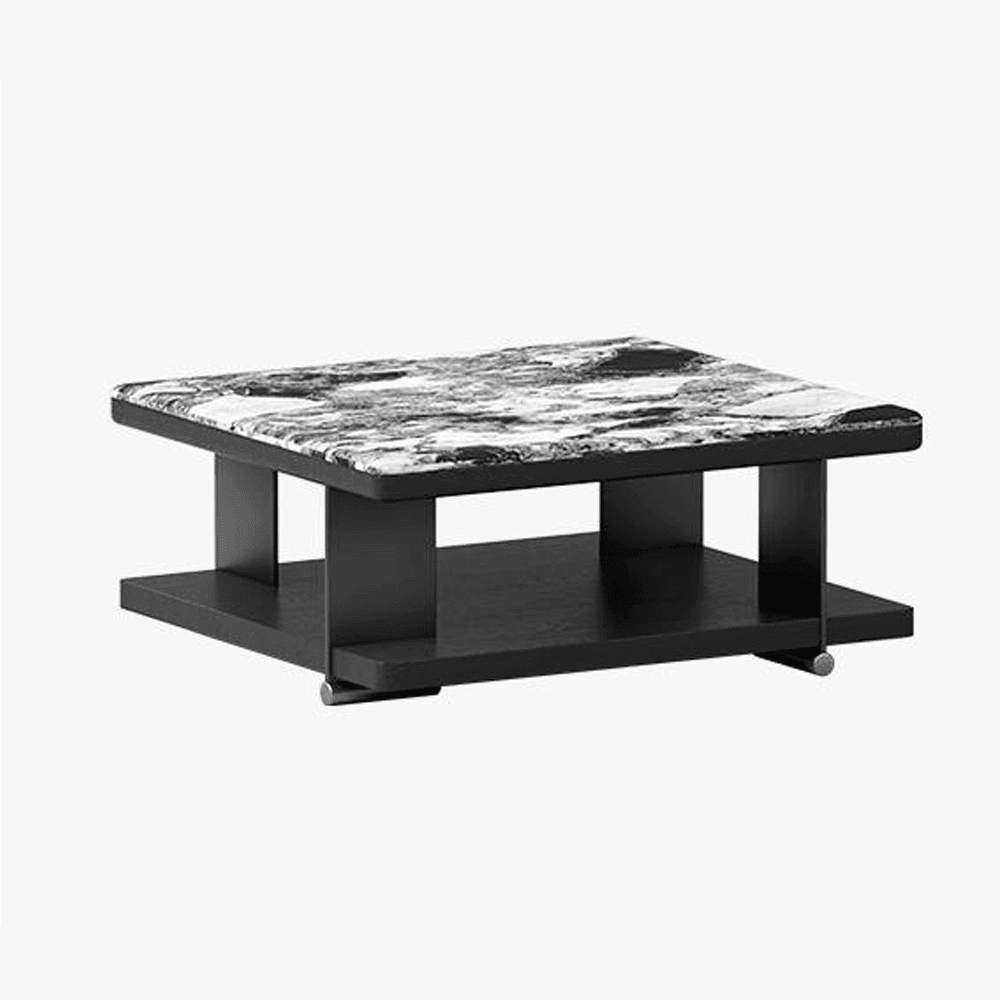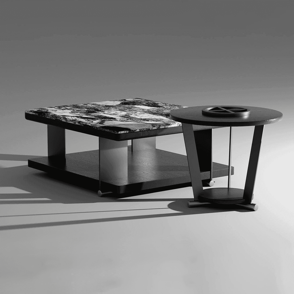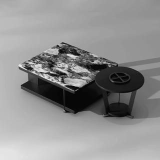 The Kai Nesting Coffee Table features a sleek and modern design, combining two different table shapes—a larger square table and a smaller round one. The larger table showcases a stunning Crystal Tech Stone top, which has a marbled appearance with a mix of black, white, and gray tones, creating a dynamic and luxurious surface. The base of the square table is minimalistic, featuring a black finish that contrasts elegantly with the intricate stone pattern on top. The smaller, round table complements the design with a similar black finish and a unique open-frame structure. The tables are designed to nest together, offering both functionality and style, making them a versatile addition to any contemporary living space.