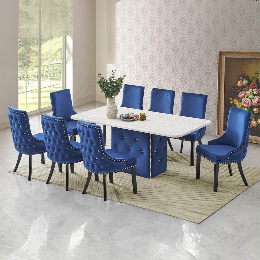 Samaira Velvet Chesterfield Dining Set with Marble Top in Royal Blue (1+8)